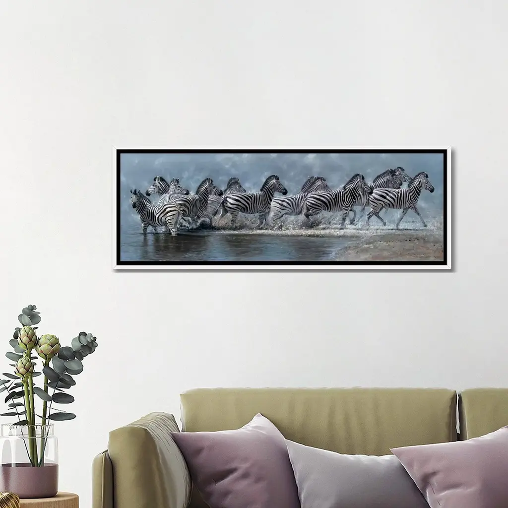 Icanvas "Flight Of The Zebras" By Pip Mcgarry Framed Canvas Print - 16x48 - White
