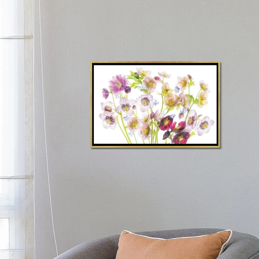 Add a touch of elegance and sophistication to your space with the iCanvas "Floral Display" by Dennis Frates Framed canvas artwork. Crafted in the USA with artist-grade canvas, this Giclee artwork offers the texture, look, and feel of a fine-art painting. The professionally hand-stretched canvas is securely stapled over North American pine-wood bars in a Gallery Wrap style, which is commonly used by artists in galleries. Mounted to a 2-inch thick, elegant hardwood frame, the artwork appears to "float" with a 3/8" space between the art and frame. The fade-resistant archival inks ensure vibrant colors that will last for decades, even when exposed to strong light. With its contemporary and uncompromising style, this artwork will add brilliance and exceptional detail to any room.Features: