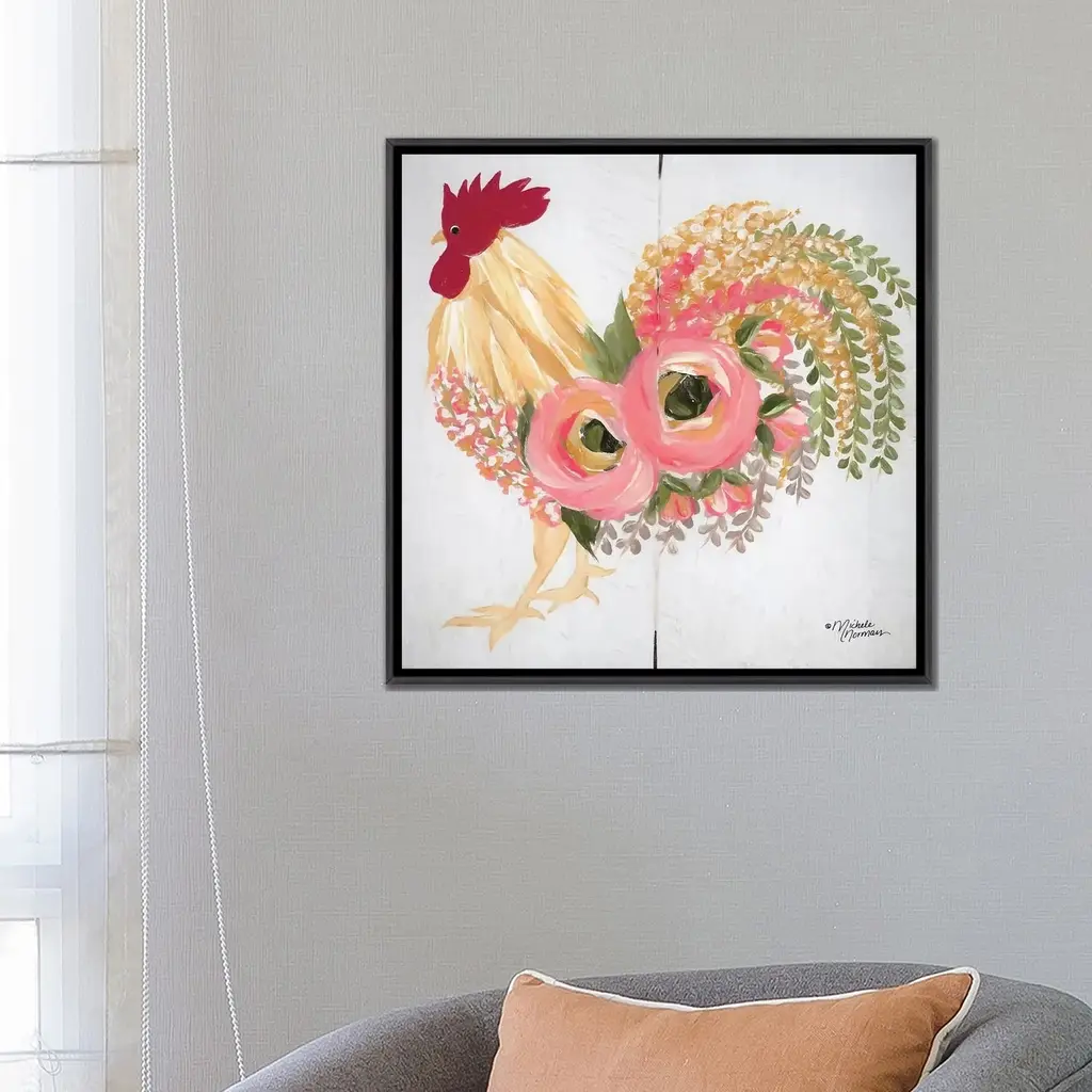 Icanvas "Floral Rooster On White" By Michele Norman Framed - Charcoal - 12x12