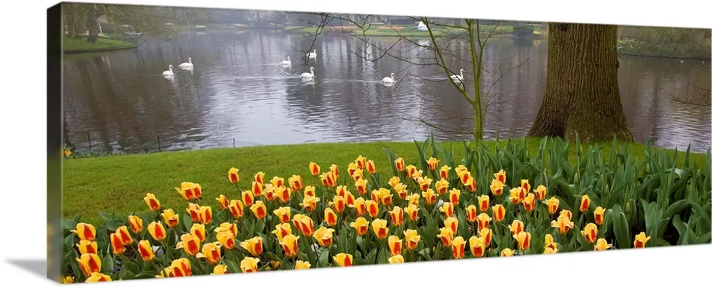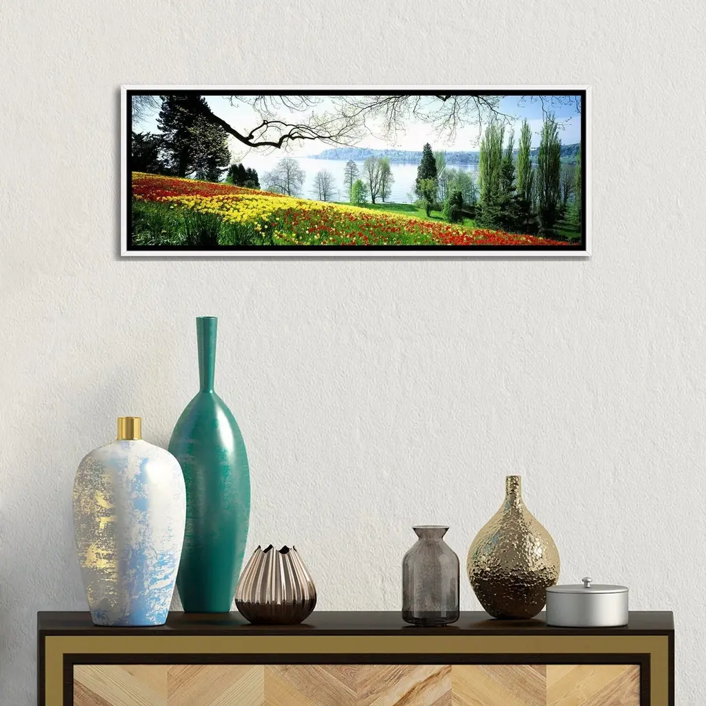 Icanvas "Flowers Near The Shoreline, Mainau (Flower Island), Germany" By Panoramic Images Framed Canvas Print - 12x36 - White