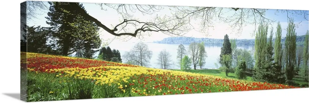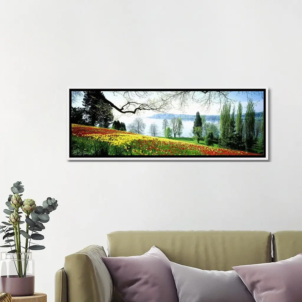 Icanvas "Flowers Near The Shoreline, Mainau (Flower Island), Germany" By Panoramic Images Framed Canvas Print - 16x48 - White