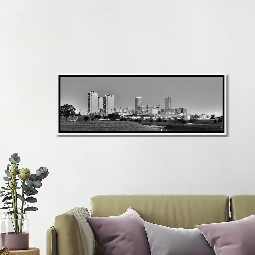 Icanvas "Fort Worth Panoramic Skyline Cityscape (Black & White - Evening)" By Unknown Artist Framed Canvas Print - 16x48 - White