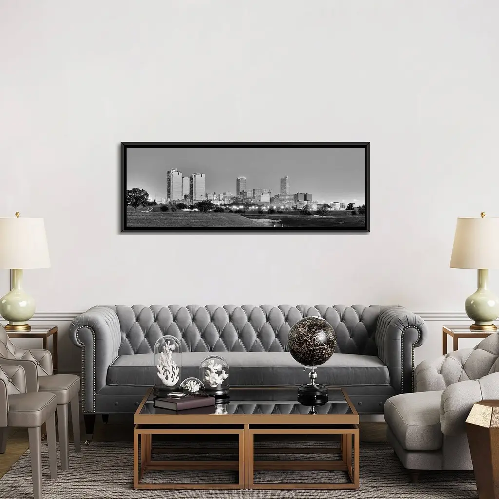 Icanvas "Fort Worth Panoramic Skyline Cityscape (Black & White - Evening)" By Unknown Artist Framed Canvas Print - 20x60 - Black