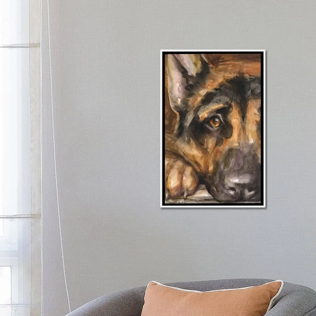Add a touch of elegance and sophistication to your space with the iCanvas "German Shepherd Sight" Framed Canvas Print by George Dyachenko. Crafted with high-quality artist-grade canvas, this Giclee artwork offers the texture, look, and feel of a fine-art painting. Professionally hand-stretched and stapled over North American pine-wood bars in Gallery Wrap style, this canvas print is mounted to a 2-inch thick hardwood frame, creating a sleek and modern "floating" illusion. The fade-resistant archival inks ensure vibrant color reproduction that will last for decades, even in strong light. Elevate your decor with this contemporary and visually striking piece.Features: