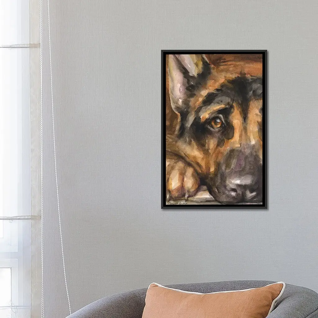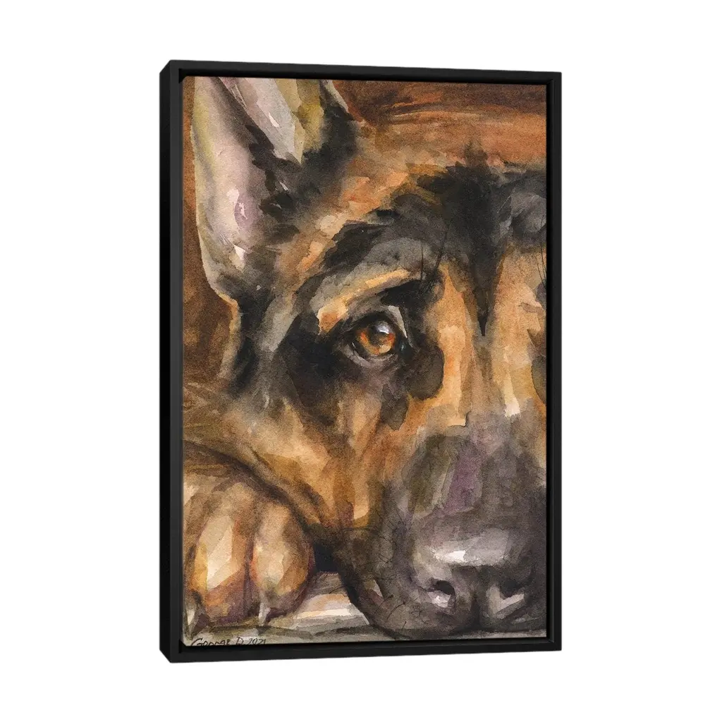 Add a touch of elegance and sophistication to your space with the iCanvas "German Shepherd Sight" Framed Canvas Print by George Dyachenko. Crafted with high-quality artist-grade canvas, this Giclee artwork offers the texture, look, and feel of a fine-art painting. Professionally hand-stretched and stapled over North American pine-wood bars in Gallery Wrap style, this canvas print is mounted to a 2-inch thick hardwood frame, creating a sleek and modern "floating" illusion. The fade-resistant archival inks ensure vibrant color reproduction that will last for decades, even in strong light. Elevate your decor with this contemporary and visually striking piece.Features: