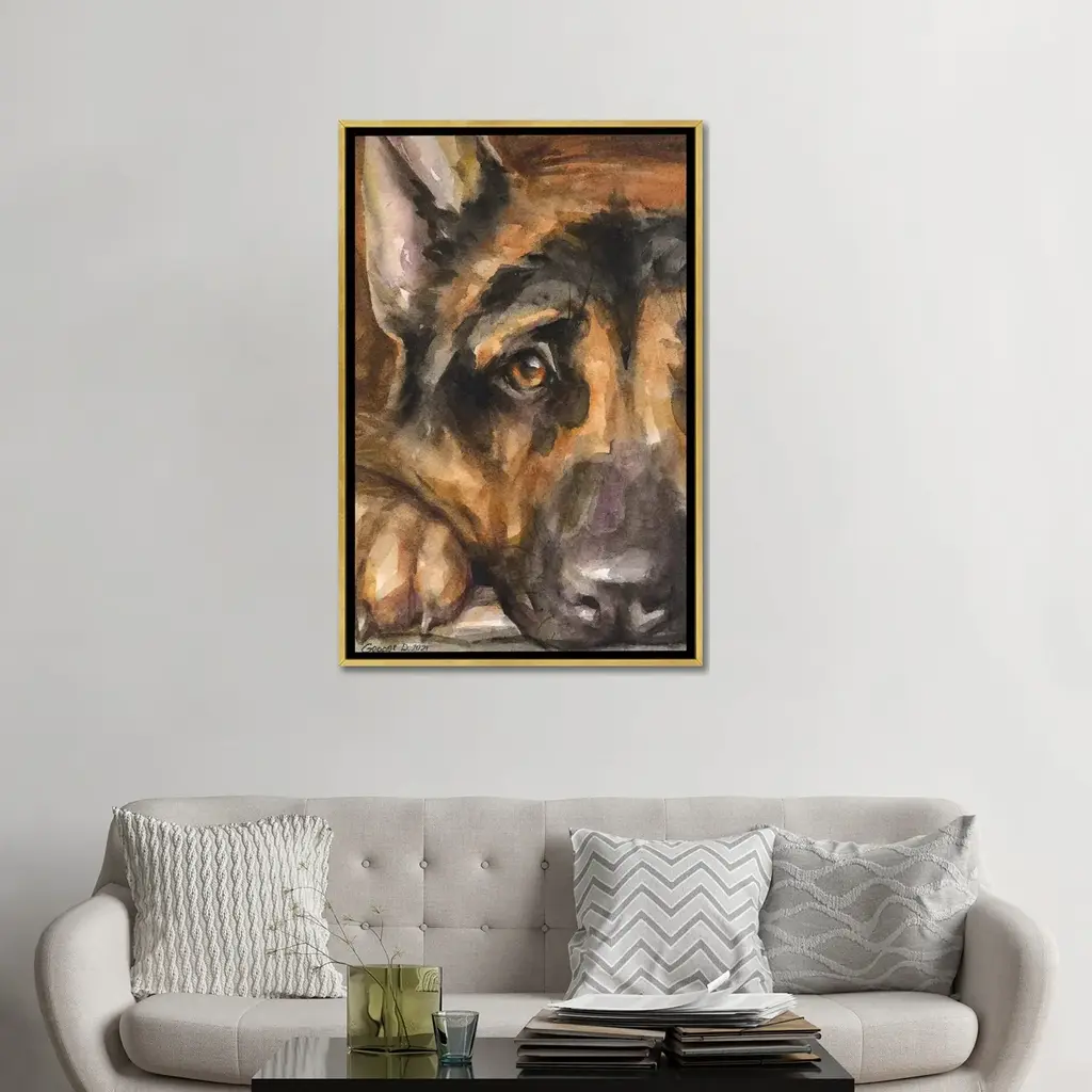 Add a touch of elegance and sophistication to your space with the iCanvas "German Shepherd Sight" Framed Canvas Print by George Dyachenko. Crafted with high-quality artist-grade canvas, this Giclee artwork offers the texture, look, and feel of a fine-art painting. Professionally hand-stretched and stapled over North American pine-wood bars in Gallery Wrap style, this canvas print is mounted to a 2-inch thick hardwood frame, creating a sleek and modern "floating" illusion. The fade-resistant archival inks ensure vibrant color reproduction that will last for decades, even in strong light. Elevate your decor with this contemporary and visually striking piece.Features: