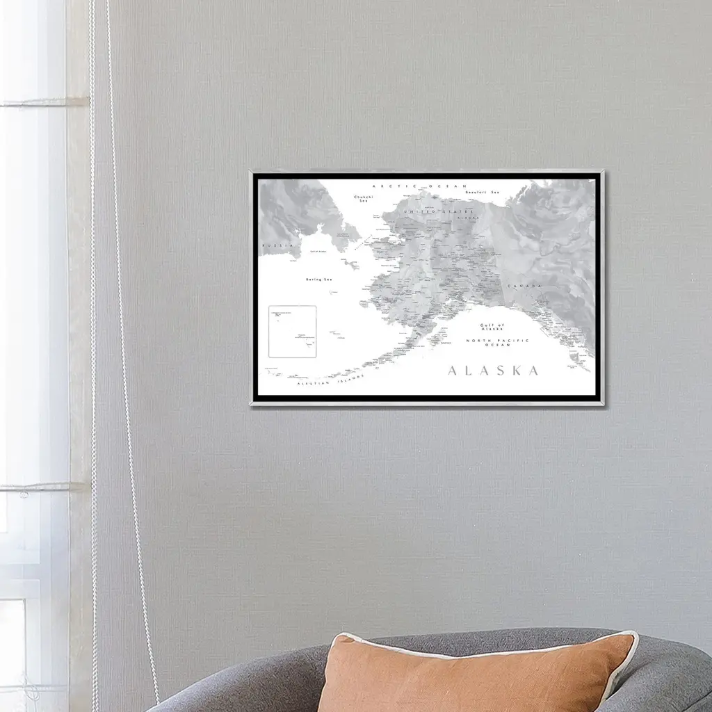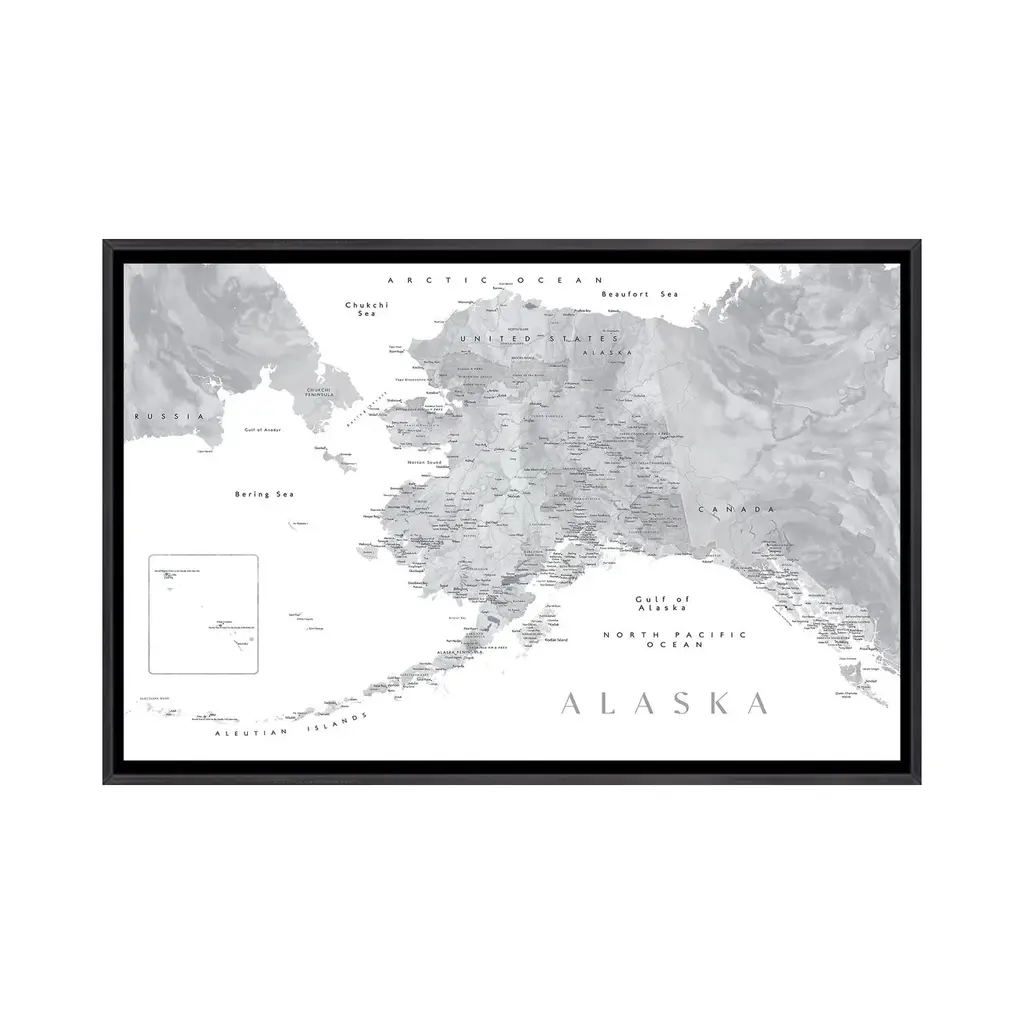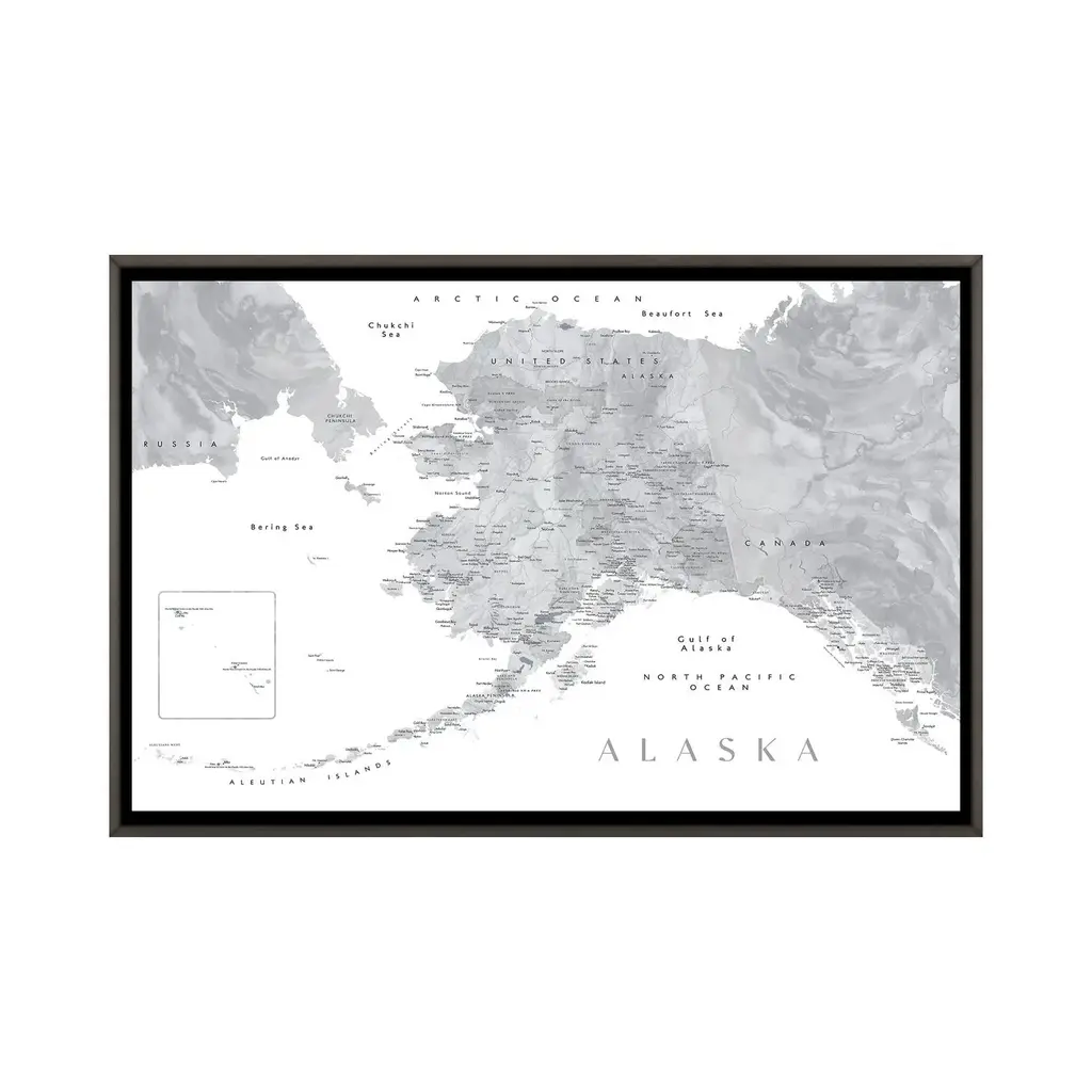Icanvas "Gray Watercolor Detailed Map Of Alaska" By Blursbyai Framed - Charcoal - 32x48