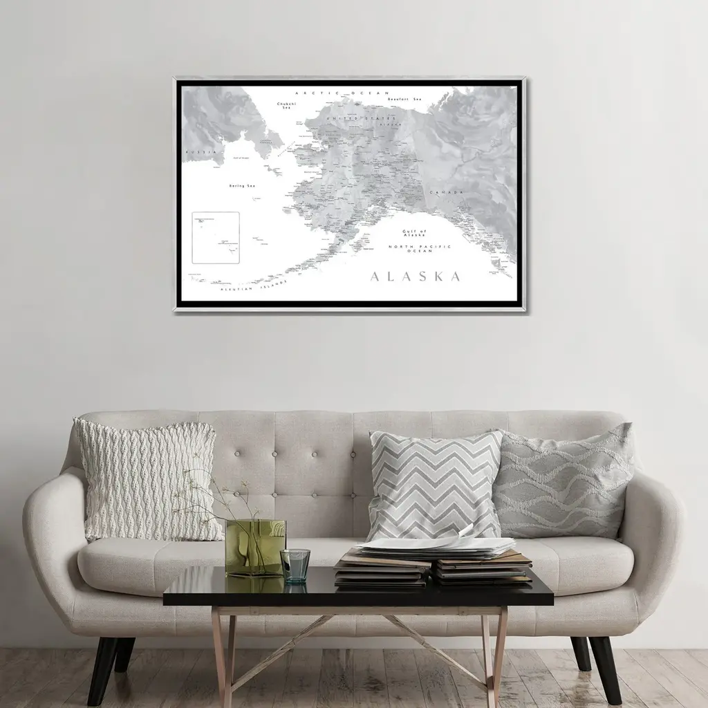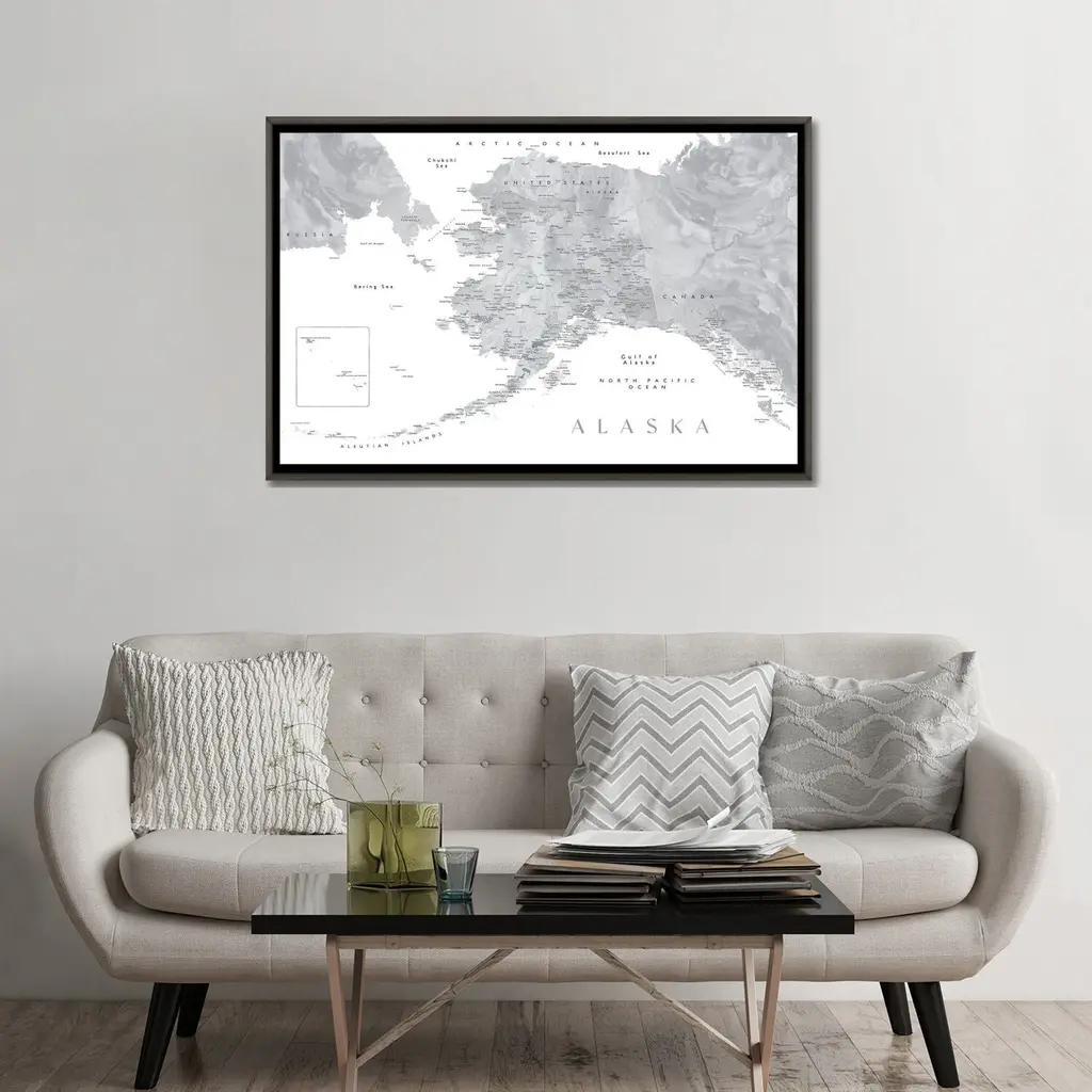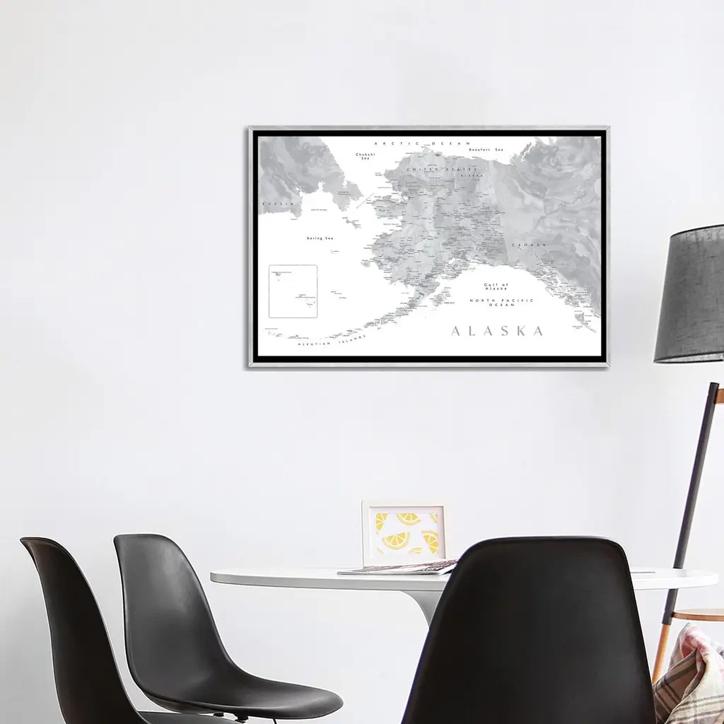 Icanvas "Gray Watercolor Detailed Map Of Alaska" By Blursbyai Framed - Charcoal - 32x48
