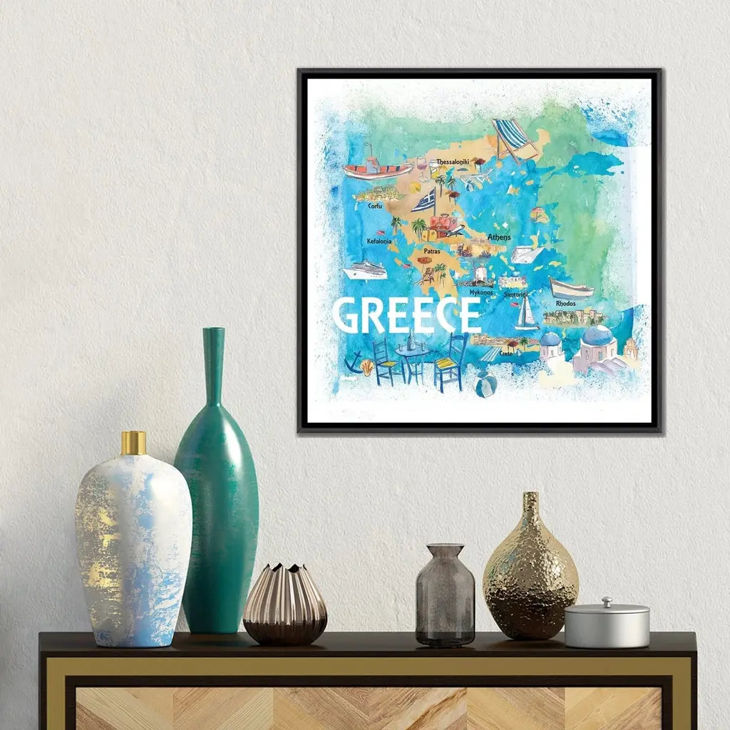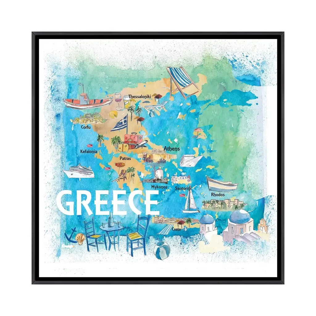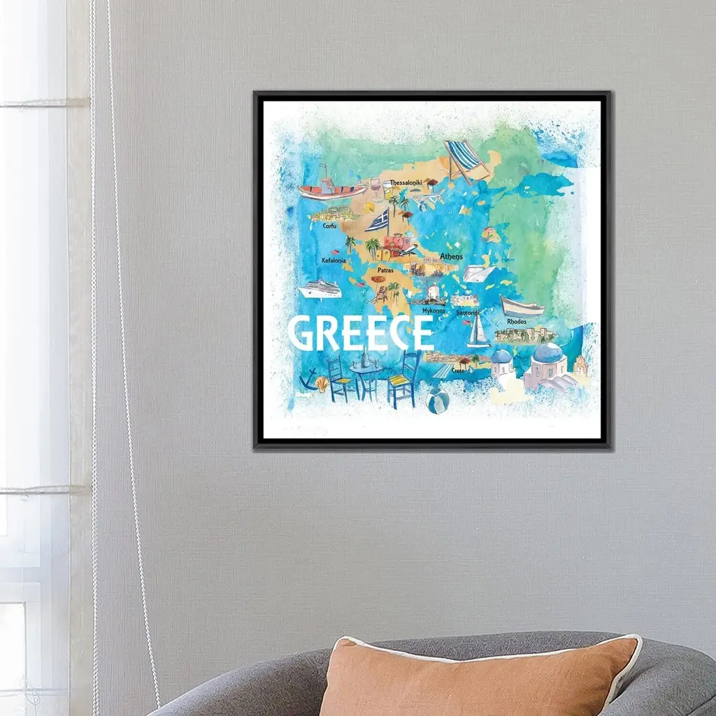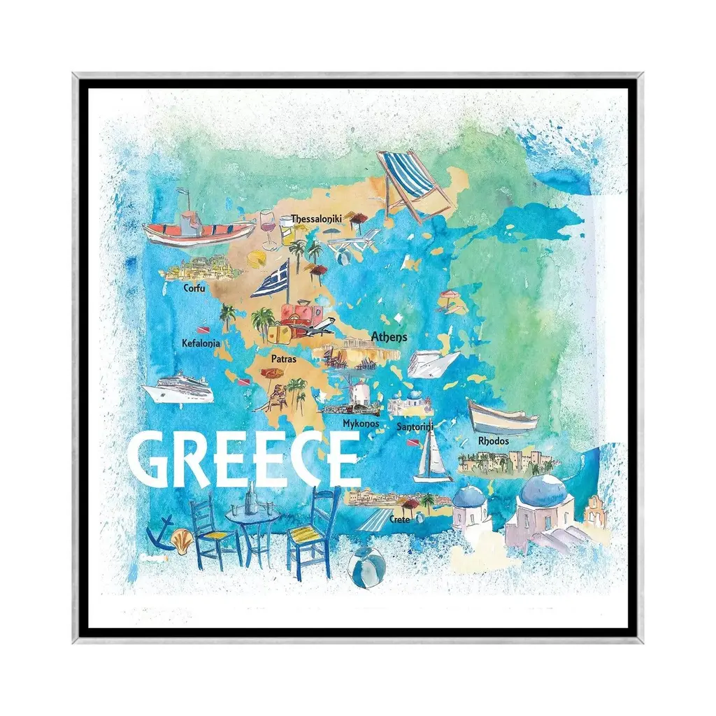 Icanvas "Greece Illustrated Travel Map With Landmarks And Highlights" By Markus & Martina Bleichner Framed - Charcoal - 12x12