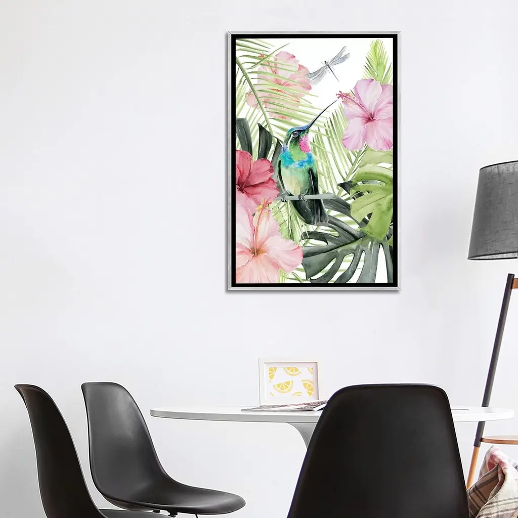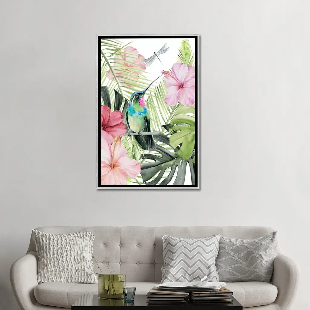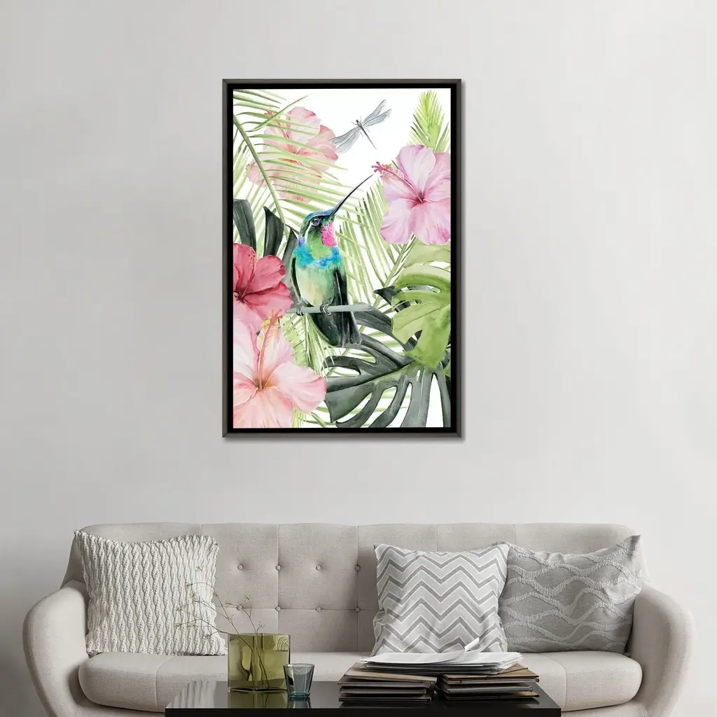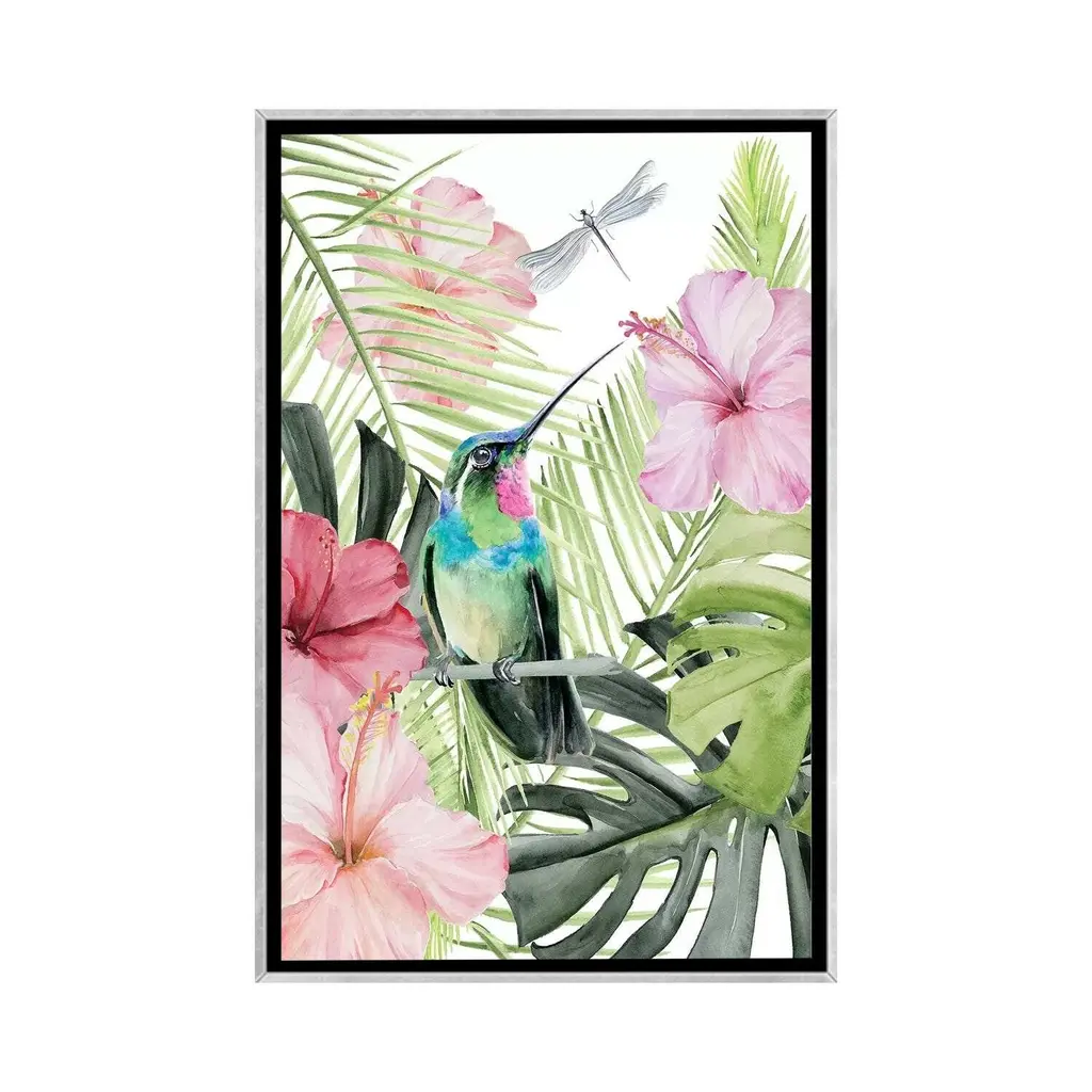Elevate your space with the iCanvas "Hibiscus & Hummingbird II" by Jennifer Paxton Parker Framed Canvas Art. Crafted in the USA with artist-grade canvas, this Giclee artwork offers the texture and look of a fine-art painting. Professionally hand-stretched and stapled over pine-wood bars in Gallery Wrap style, it presents a "floating" illusion with a 3/8" space between the art and frame. The fade-resistant archival inks ensure vibrant color reproduction for decades. With its contemporary style and exceptional detail, this framed canvas art adds brilliance to any room.Features: