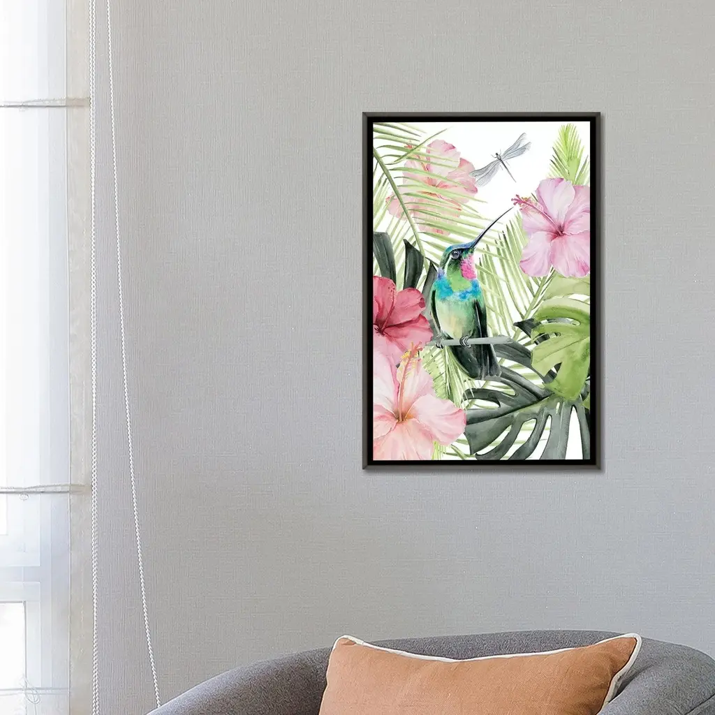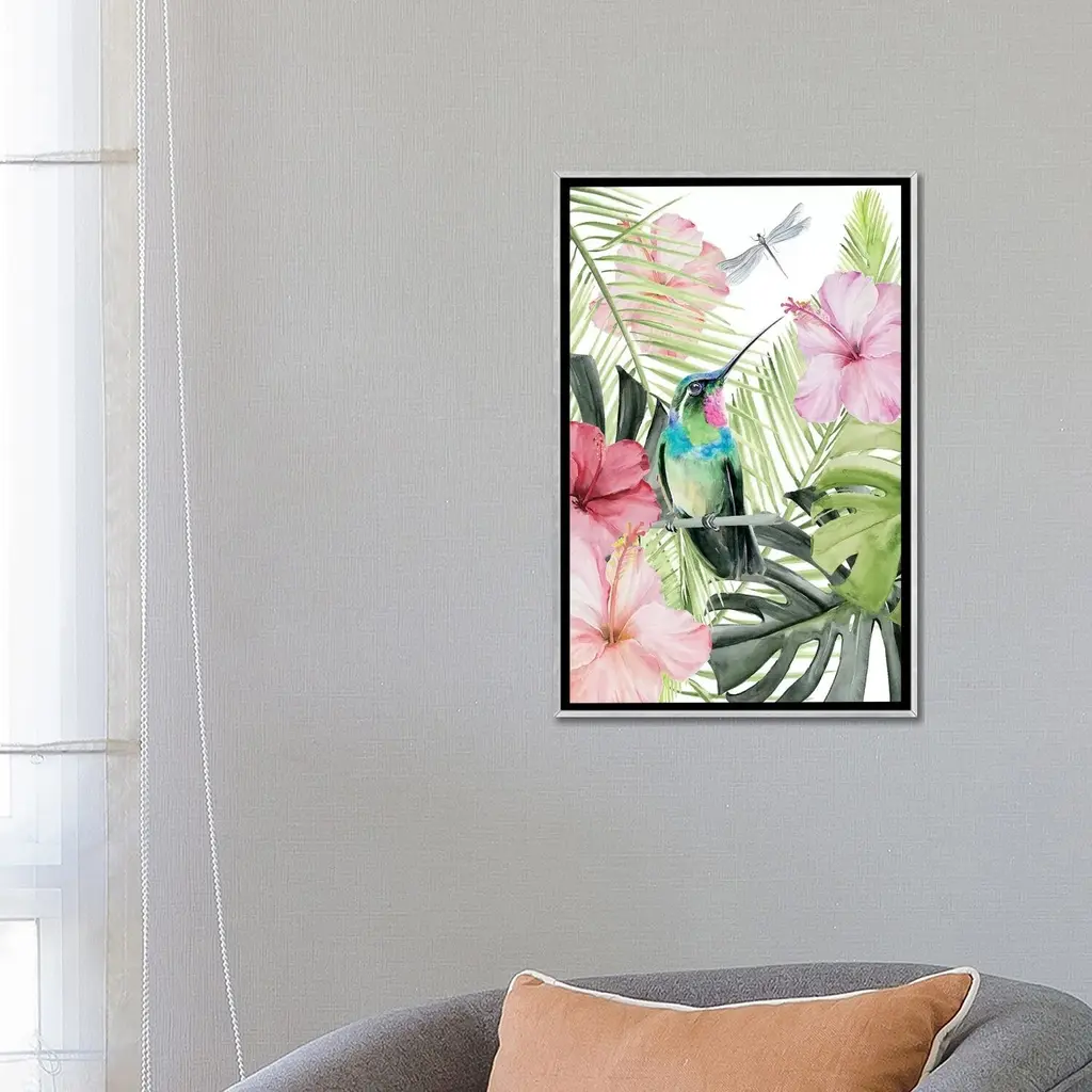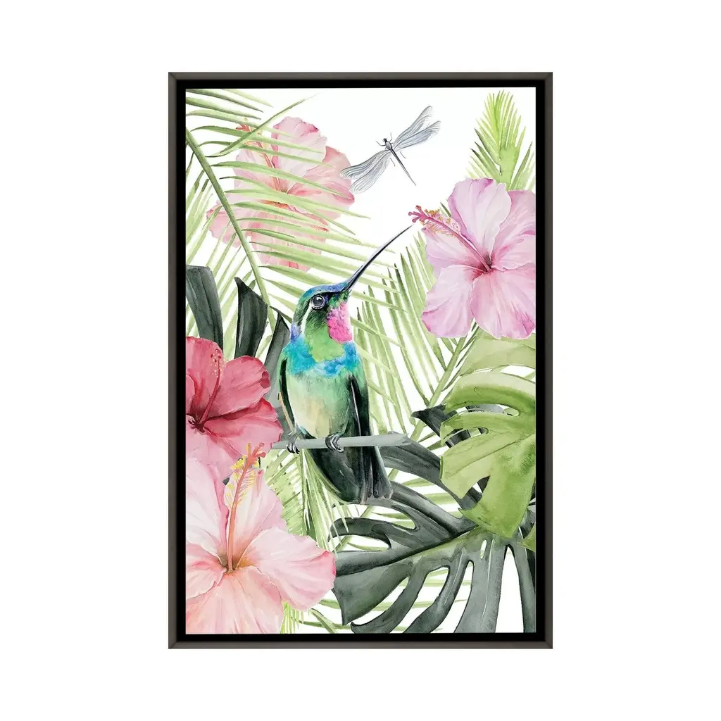 Elevate your space with the iCanvas "Hibiscus & Hummingbird II" by Jennifer Paxton Parker Framed Canvas Art. Crafted in the USA with artist-grade canvas, this Giclee artwork offers the texture and look of a fine-art painting. Professionally hand-stretched and stapled over pine-wood bars in Gallery Wrap style, it presents a "floating" illusion with a 3/8" space between the art and frame. The fade-resistant archival inks ensure vibrant color reproduction for decades. With its contemporary style and exceptional detail, this framed canvas art adds brilliance to any room.Features:
