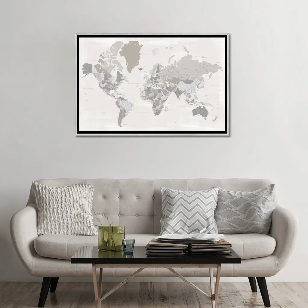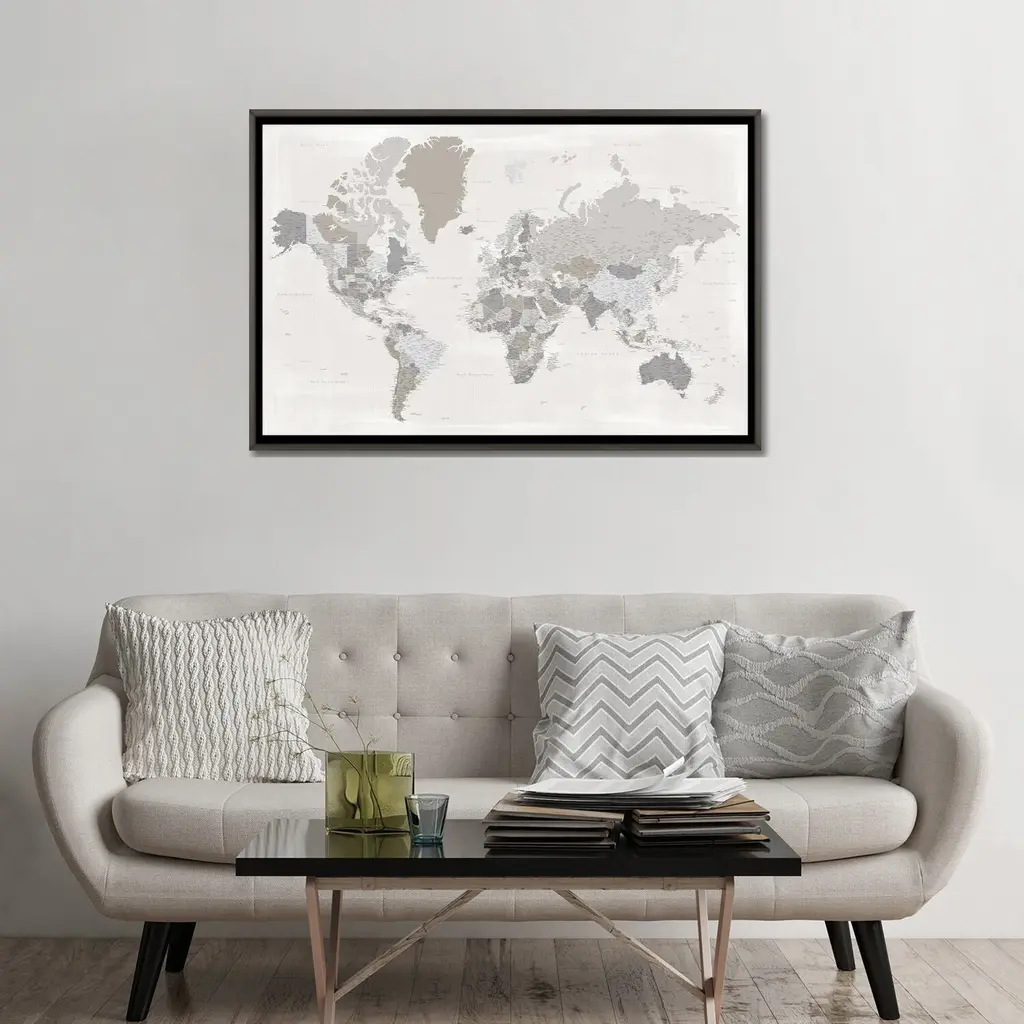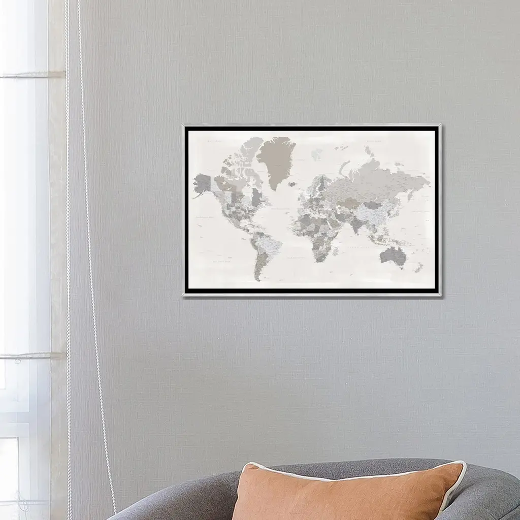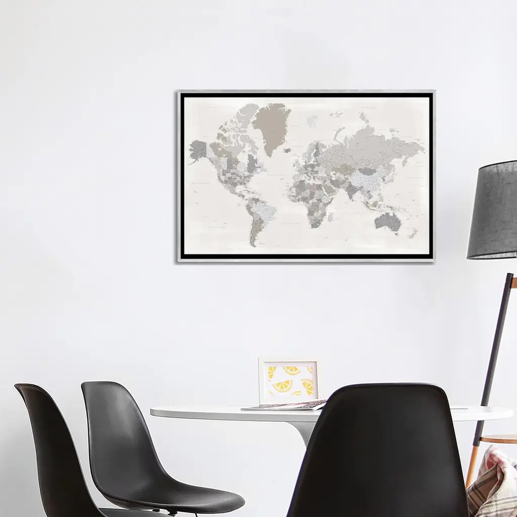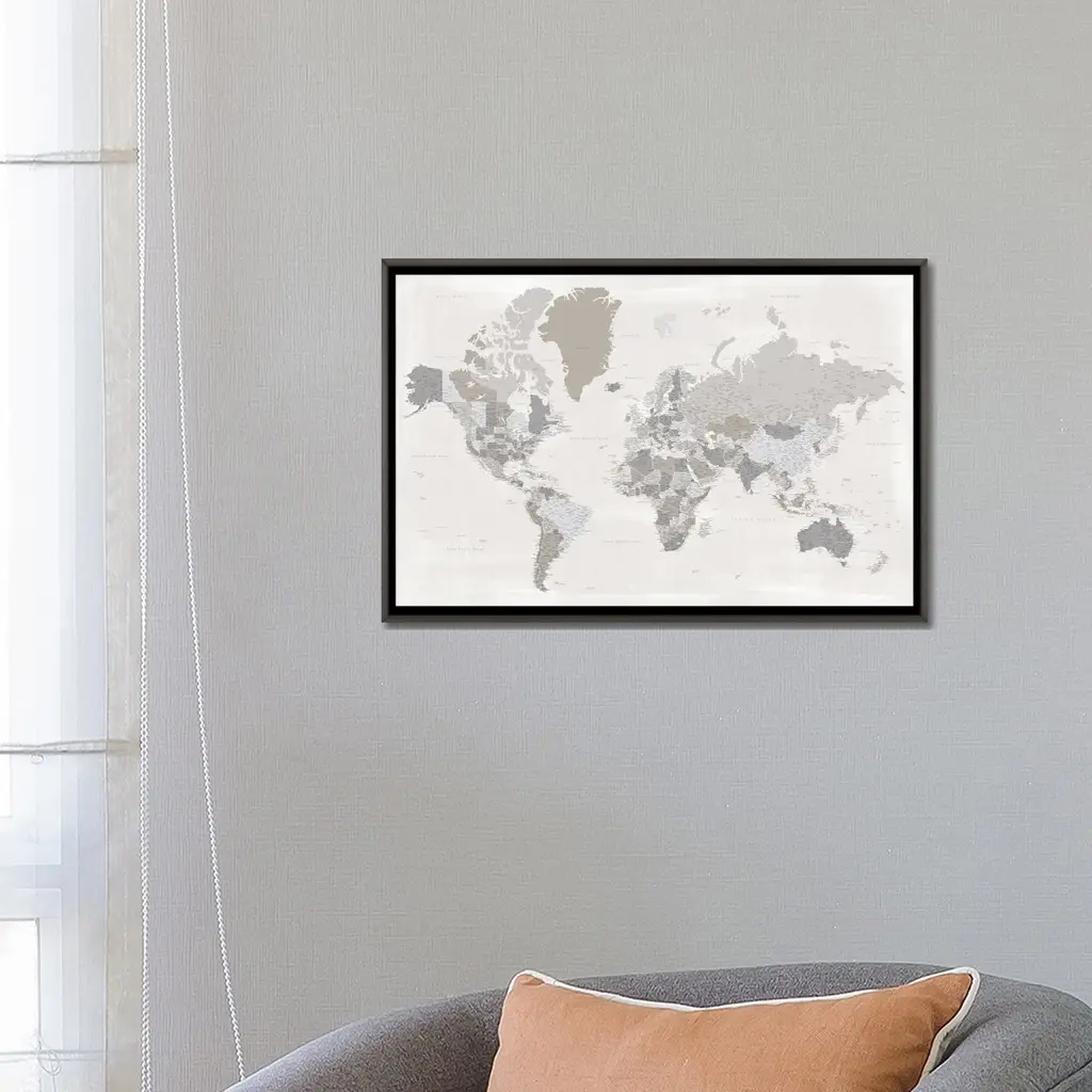 Icanvas "Highly Detailed World Map In Taupe, Donah" By Blursbyai Framed - Ebony - 18x26