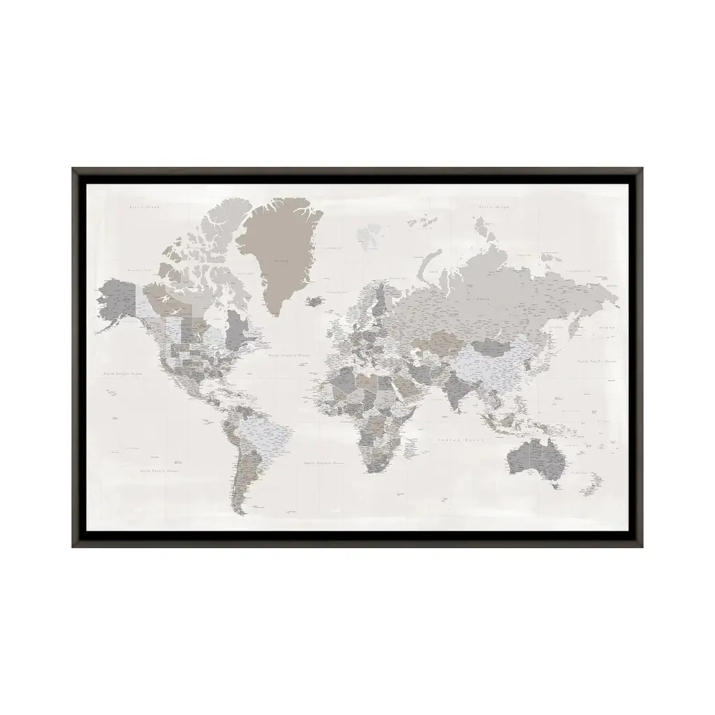 Icanvas "Highly Detailed World Map In Taupe, Donah" By Blursbyai Framed - Ebony - 26x40