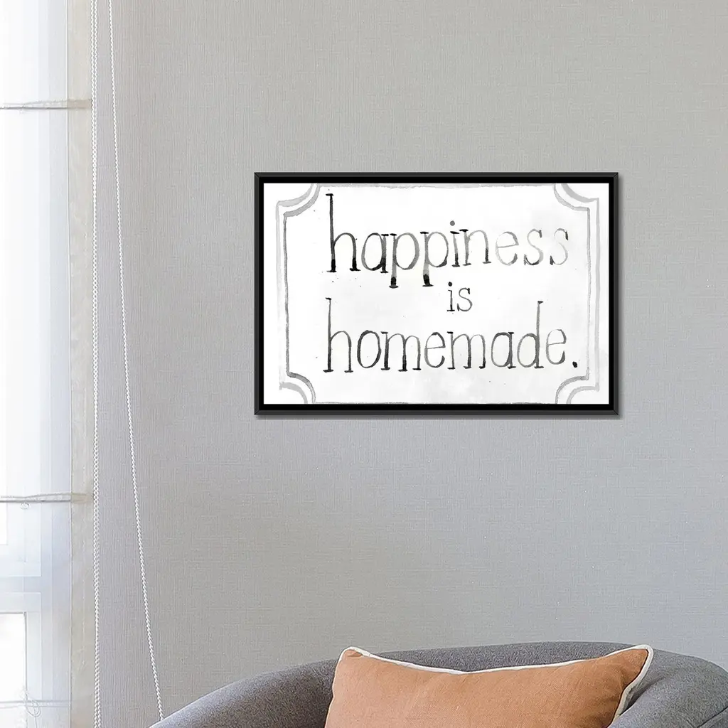 Elevate your space with the iCanvas "Homemade Happy I" by Jennifer Paxton Parker Framed artwork. Made with premium artist-grade canvas, this Giclee canvas artwork offers the texture and feel of a fine-art painting. Crafted in the USA, it features a Gallery Wrap style with the canvas professionally hand-stretched and stapled over pine-wood bars. The 2-inch thick hard wood frame adds an elegant touch, with a 3/8" space between the art and frame for a "floating" illusion. The fade-resistant archival inks ensure vibrant colors that last for decades, even in strong light. Embrace contemporary style and exceptional detail with this stunning piece.Features: