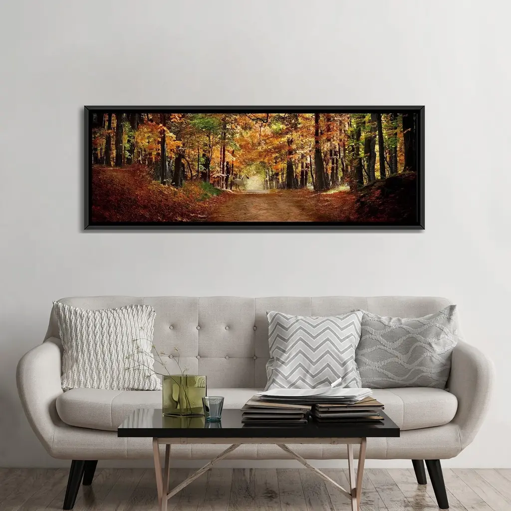 Icanvas "Horse Running Across Road In Fall Colors" By Panoramic Images Framed Canvas Print - 24x72 - Black