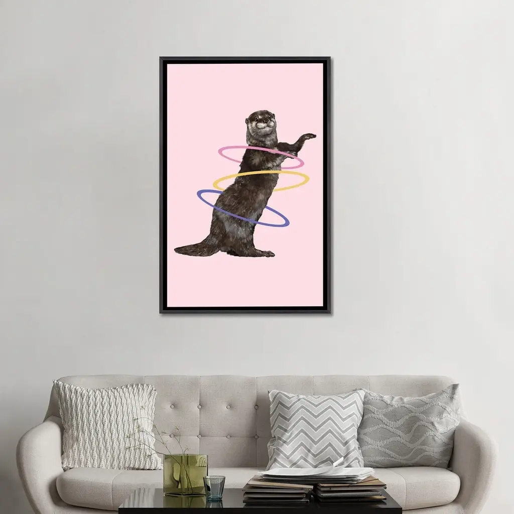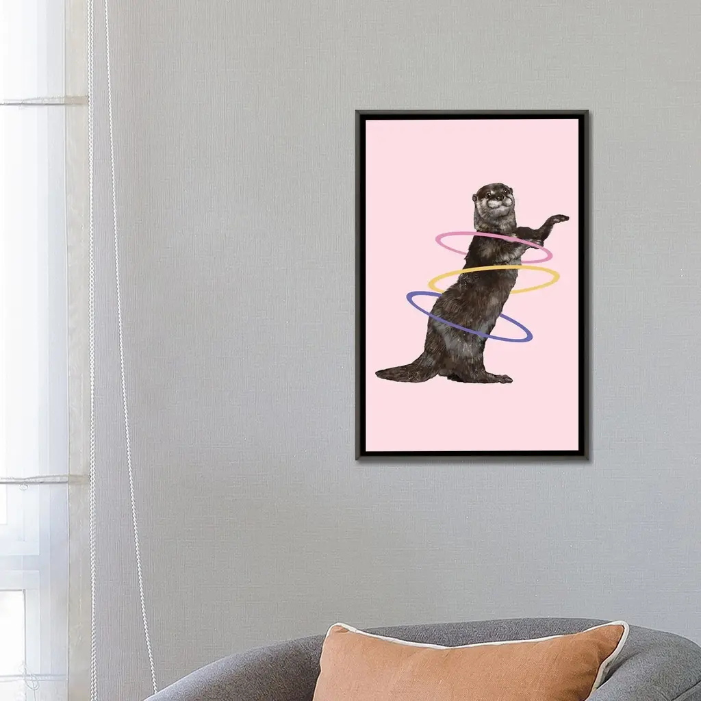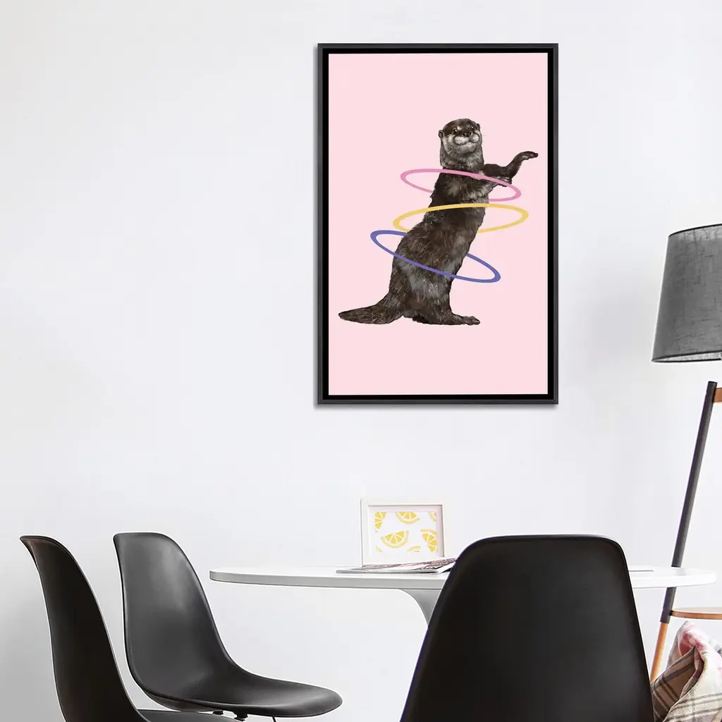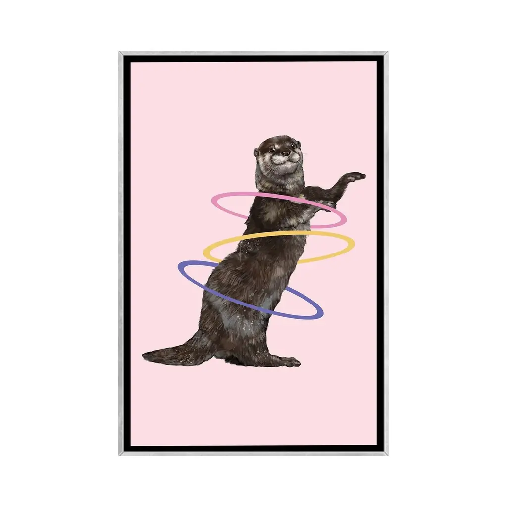 Icanvas "Hula Hooping Otter In Pink" By Big Nose Work Framed - Ebony - 26x18