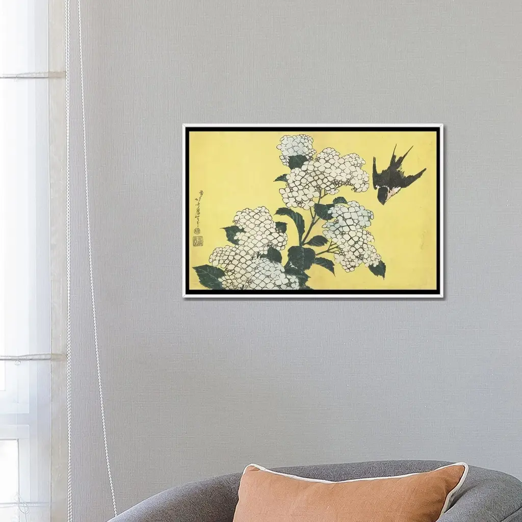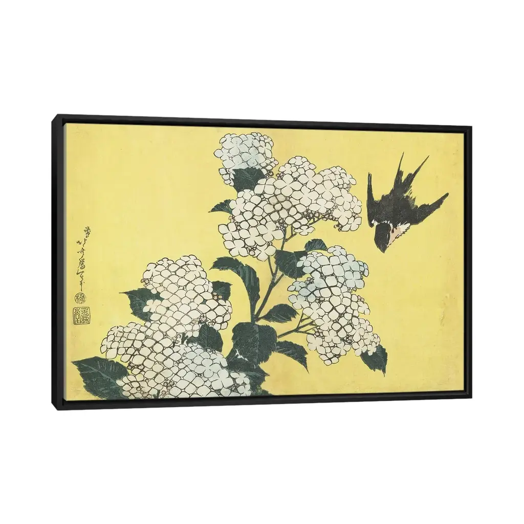 Icanvas "Hydrangea And Swallow, C.1832" By Katsushika Hokusai Framed Canvas Print - Gold - 26x40