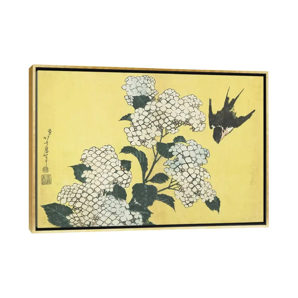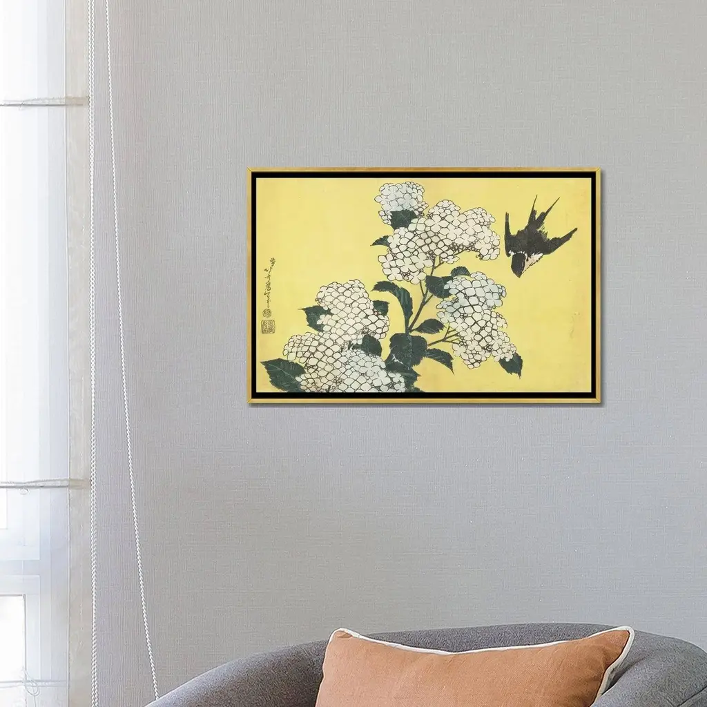 Icanvas "Hydrangea And Swallow, C.1832" By Katsushika Hokusai Framed Canvas Print - White - 18x26