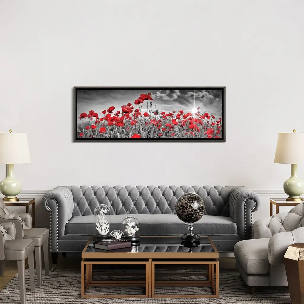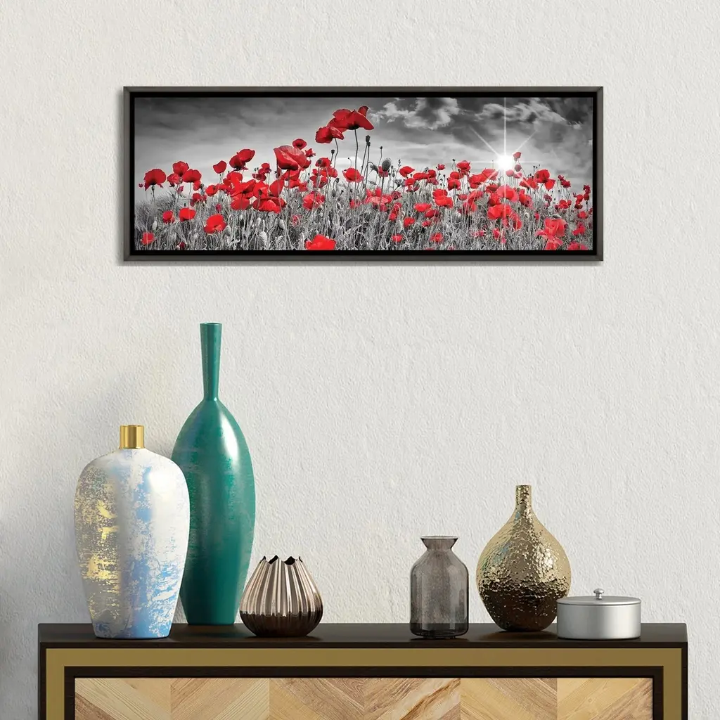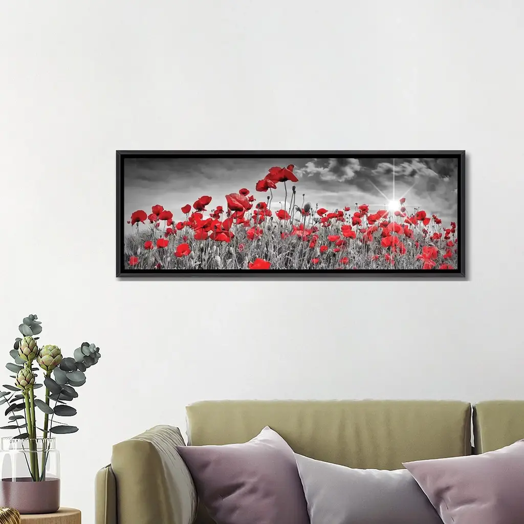 Icanvas "Idyllic Field Of Poppies With Sun Panorama" By Melanie Viola Framed - 20x60 - Ebony
