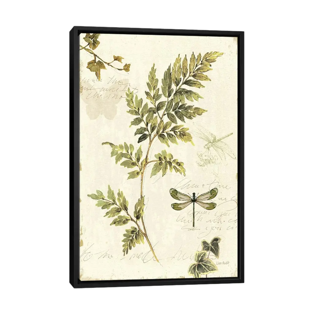 Elevate your space with the iCanvas "Ivies and Ferns III" by Lisa Audit Framed Canvas Print. Crafted with artist-grade canvas, this giclee artwork offers the texture and appearance of a fine-art painting. Made in the USA, it features a Gallery Wrap style with the canvas professionally stretched and stapled over pine-wood bars. The 2-inch thick hardwood frame adds an elegant touch, while the inset art creates a "floating" illusion. With fade-resistant archival inks, the vibrant colors will remain true for decades. Bring contemporary style and exceptional detail to your home or office with this stunning piece.Features: