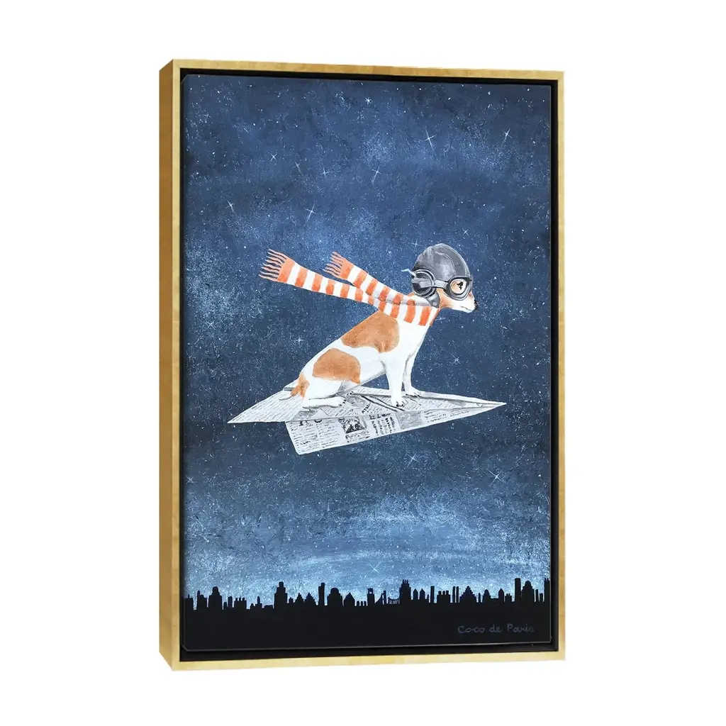 Icanvas "Jack Russell On A Paper Plane" By Coco De Paris Framed Canvas Print - Gold - 26x18
