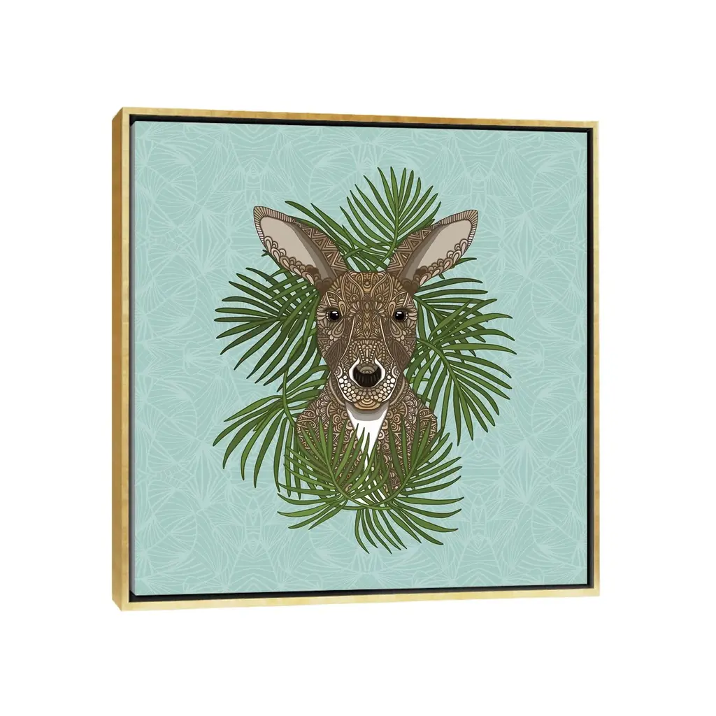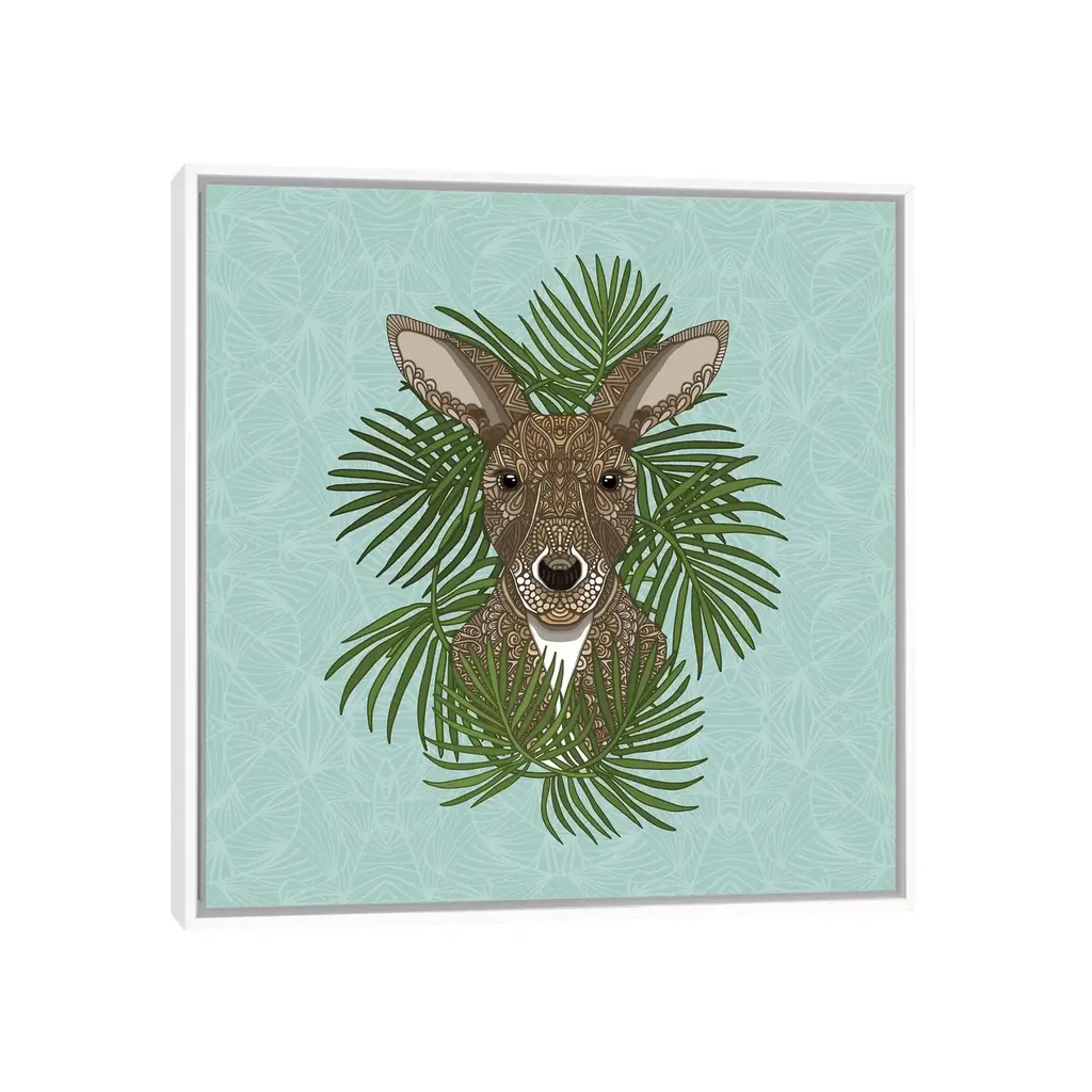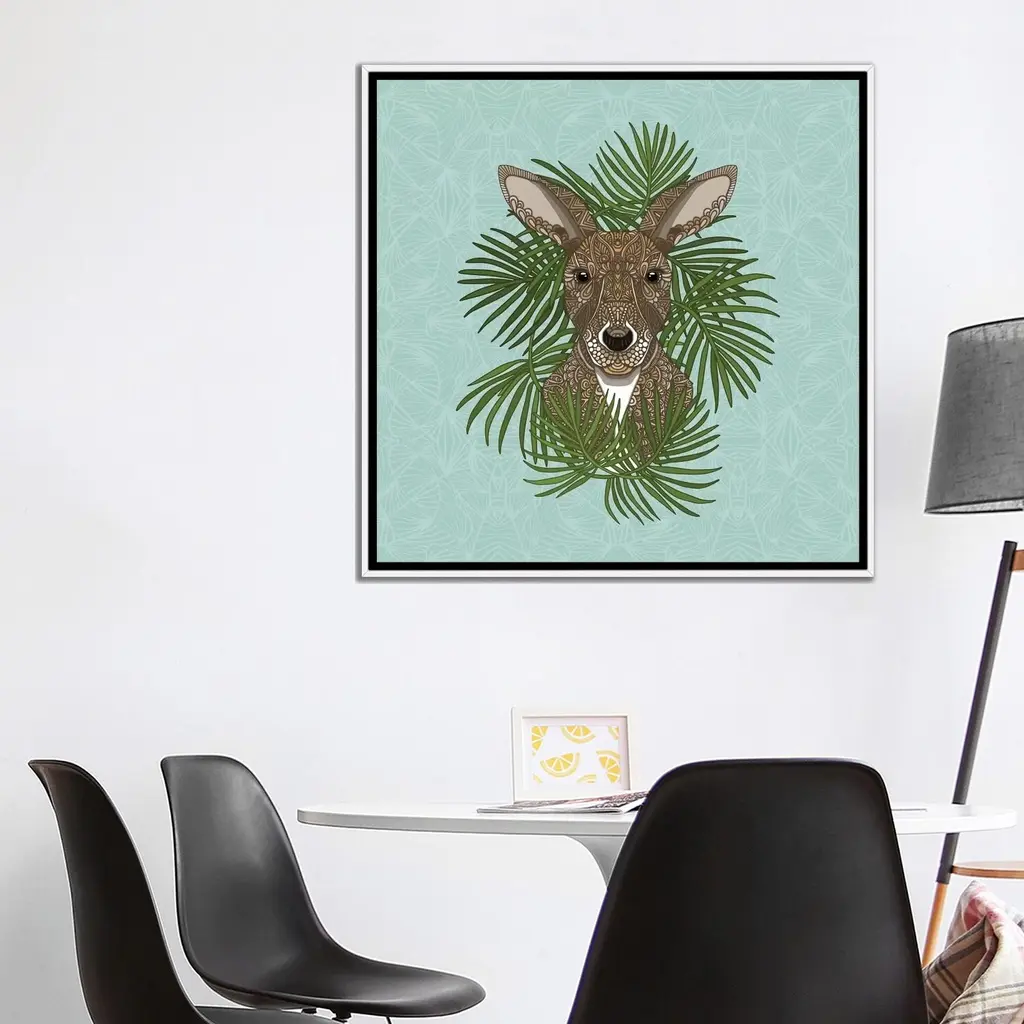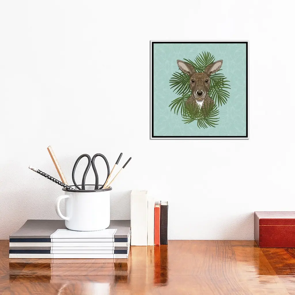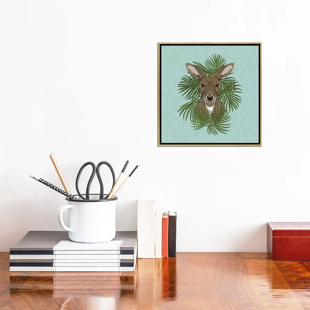 Add brilliance and exceptional detail to your space with the iCanvas "Kangaroo" by Angelika Parker Framed Canvas Print. Crafted in the USA with artist-grade canvas, this Giclee canvas artwork offers the texture, look, and feel of fine-art paintings. Professionally hand-stretched and stapled over North American pine-wood bars in Gallery Wrap style, this artwork is presented in the same method utilized by artists in galleries. The canvas print is mounted to a 2-inch thick, elegant hard wood frame, creating a "floating" illusion with a 3/8" space between the art and frame. With fade-resistant archival inks, the colors will remain vibrant for decades, even when exposed to strong light. Experience contemporary style at its finest with this Kangaroo artwork.Features: