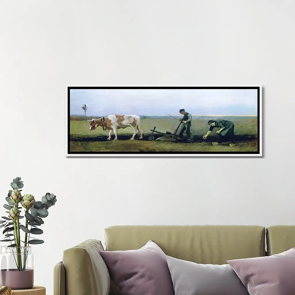 Icanvas "Labourer And Peasant Planting Potatoes, 1884 " By Vincent Van Gogh Framed Canvas Print - 16x48 - White