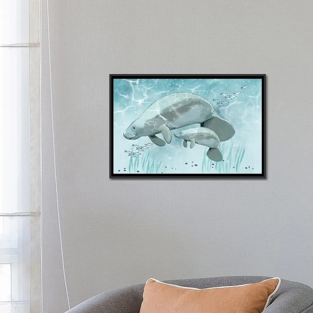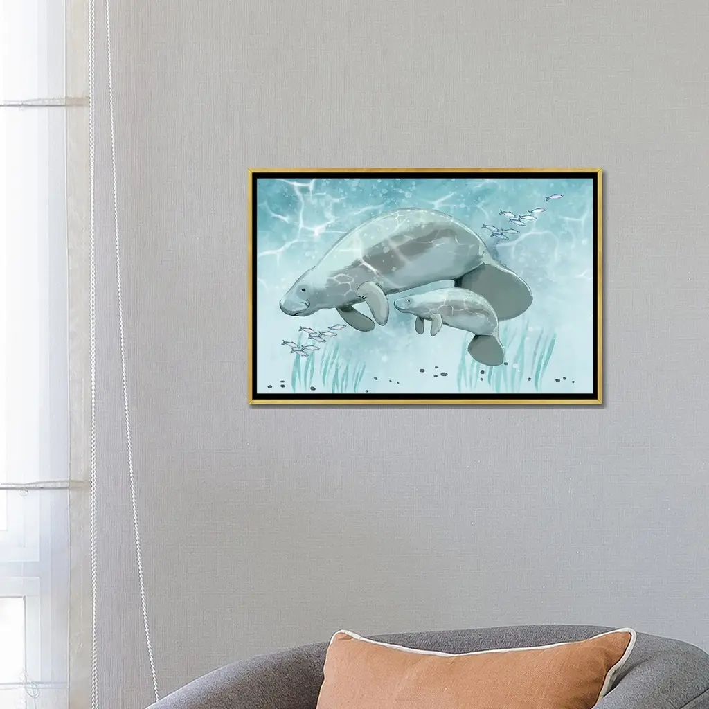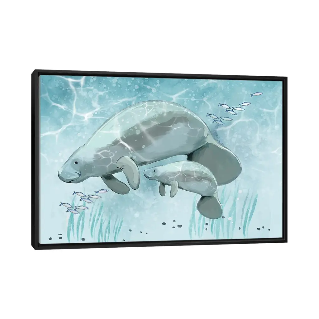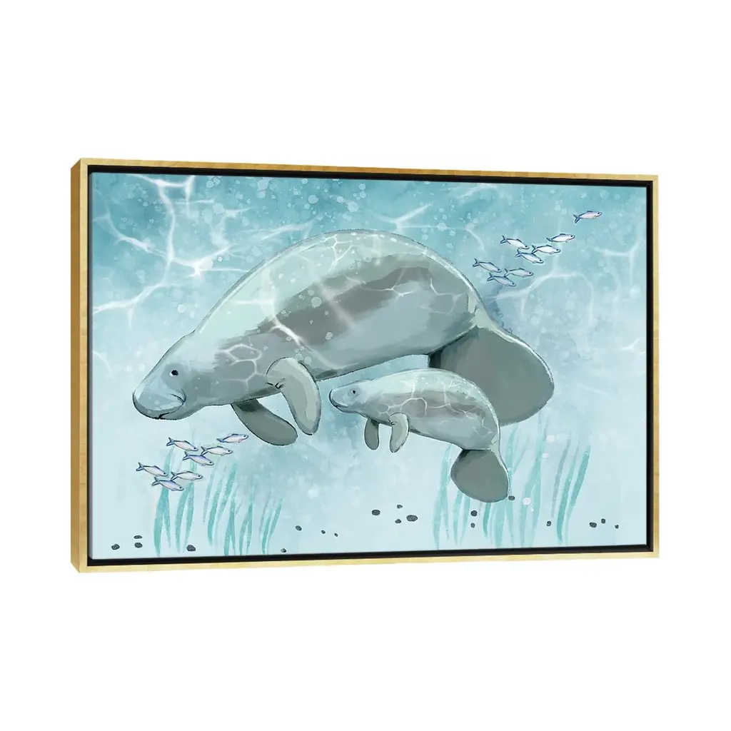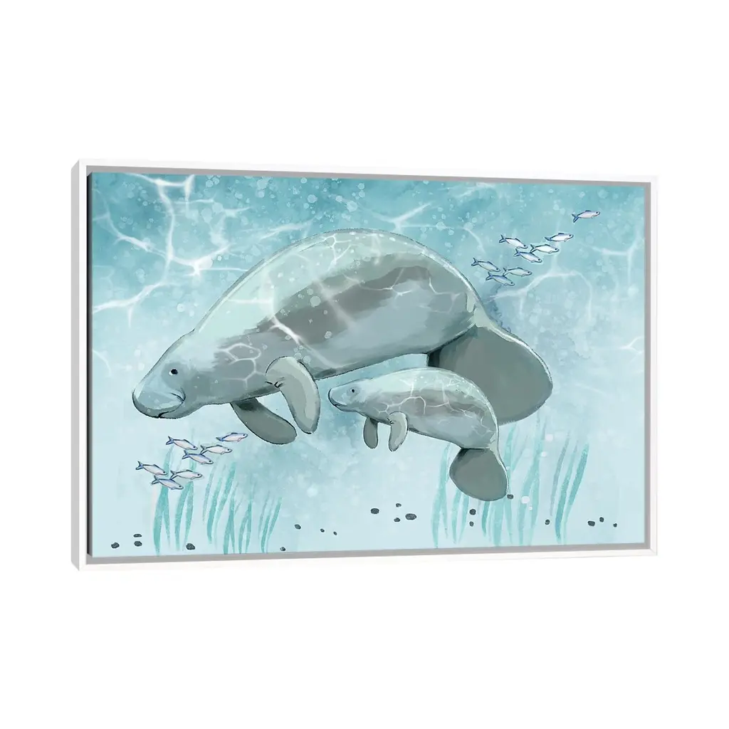 Icanvas "Mama And Baby Manatee" By Thomas Little Framed Canvas Print - White - 18x26