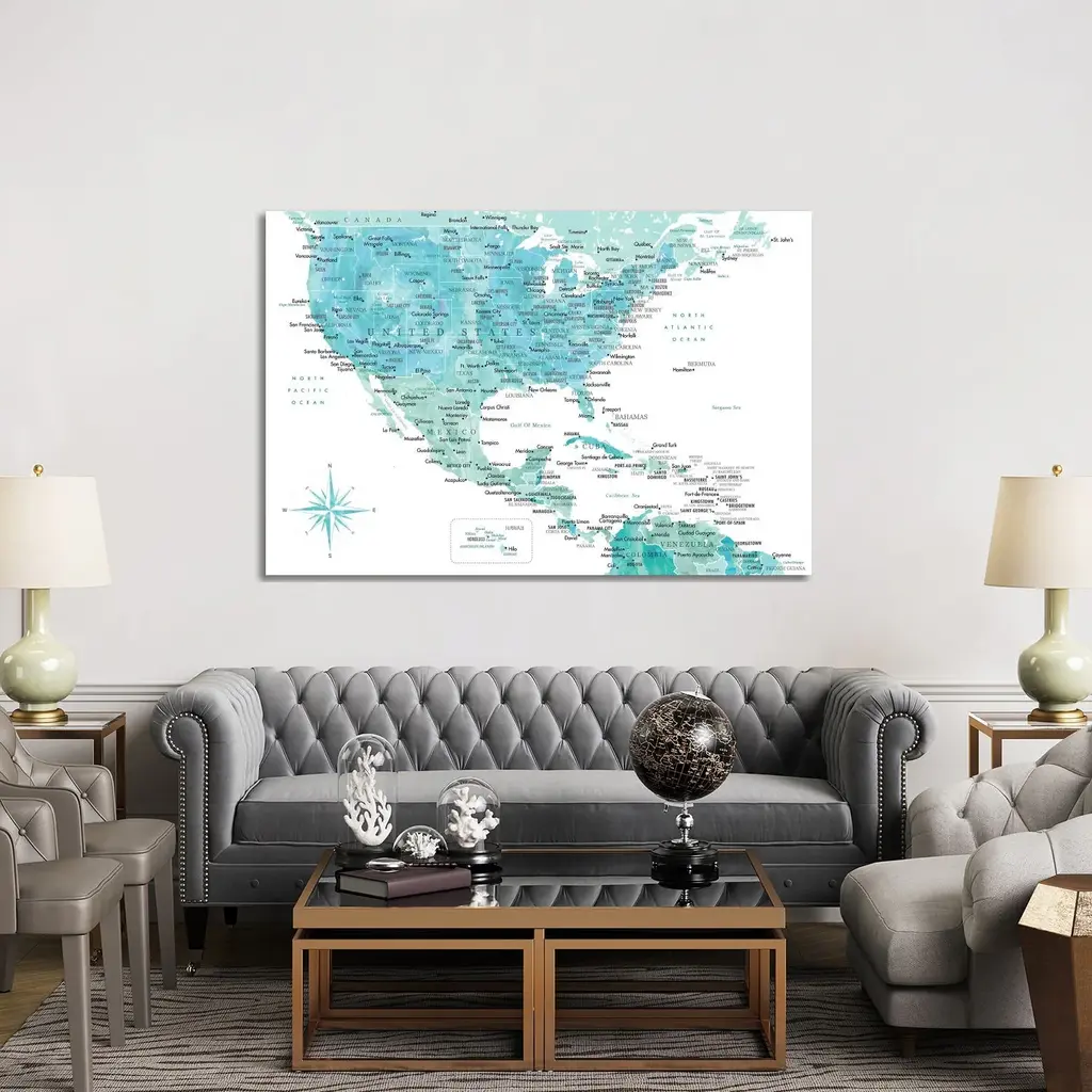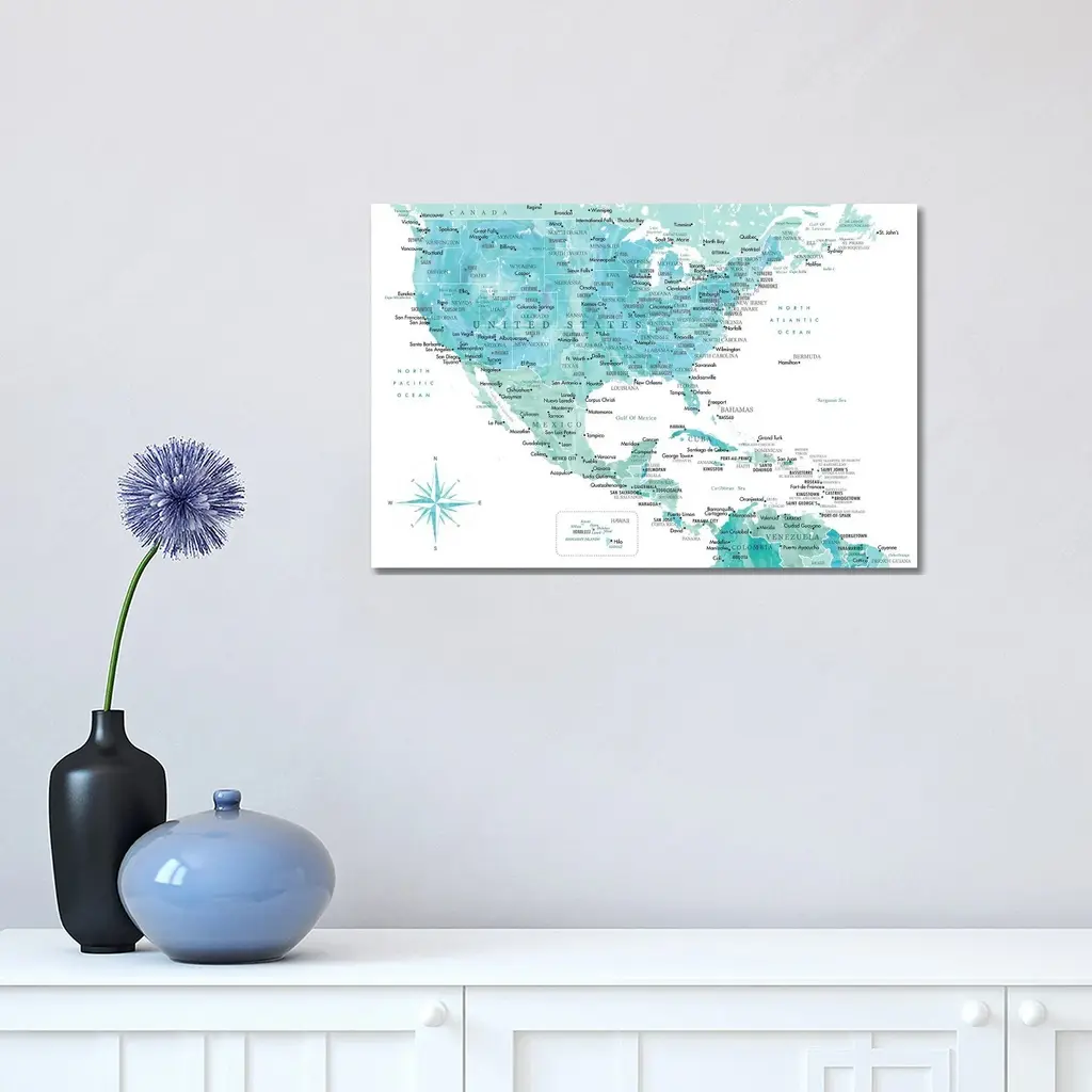 Icanvas "Map Of The Usa And The Caribbean Area In Aquamarine Watercolor" By Blursbyai Canvas Print - 18x26x1.5
