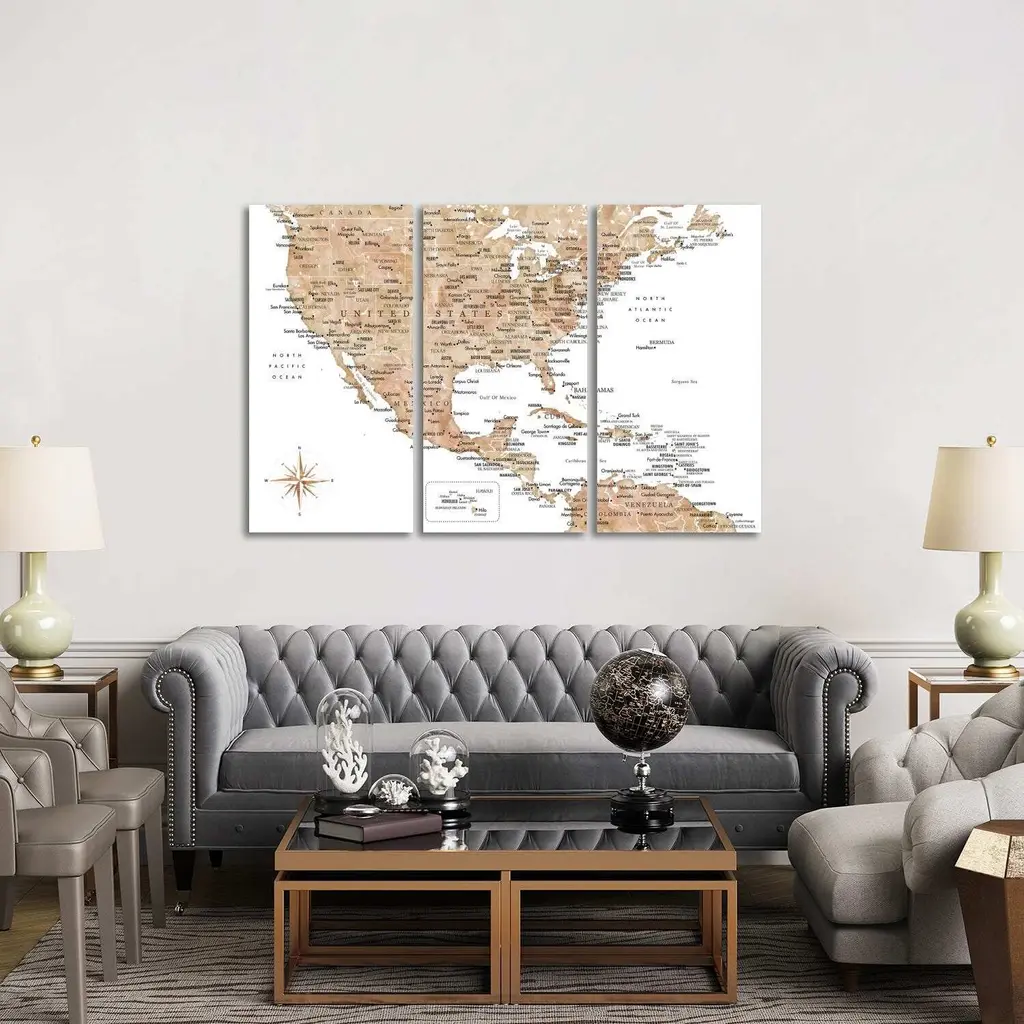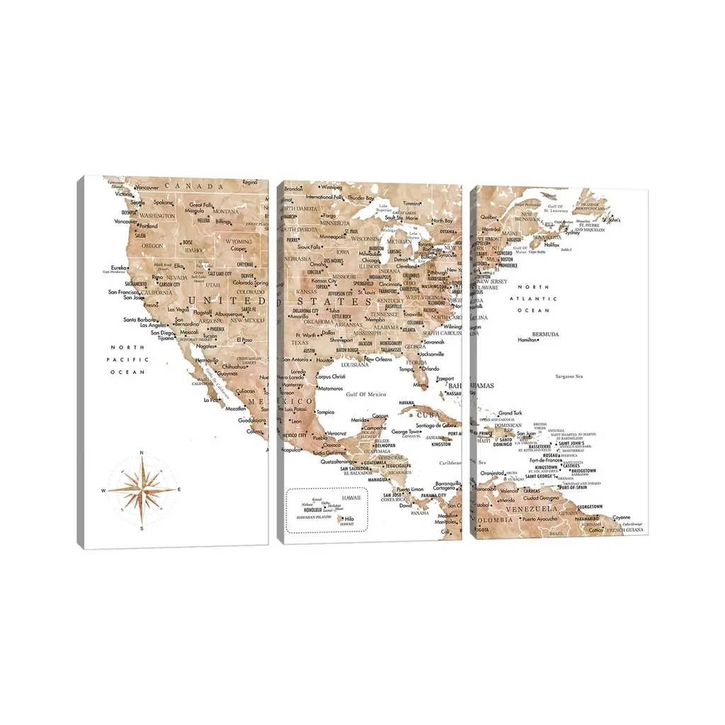 Icanvas "Map Of The Usa And The Caribbean Area In Brown Watercolor" By Blursbyai 3-Piece Canvas Wall Art Set - 40x60x1.5