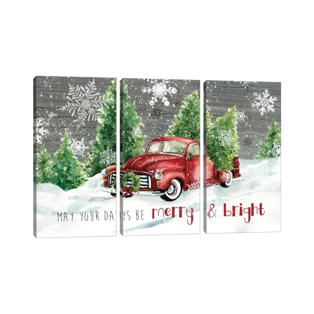 Icanvas "Merry And Bright Christmas Truck" By Carol Robinson 3-Piece Canvas Wall Art Set - 40x60x1.5