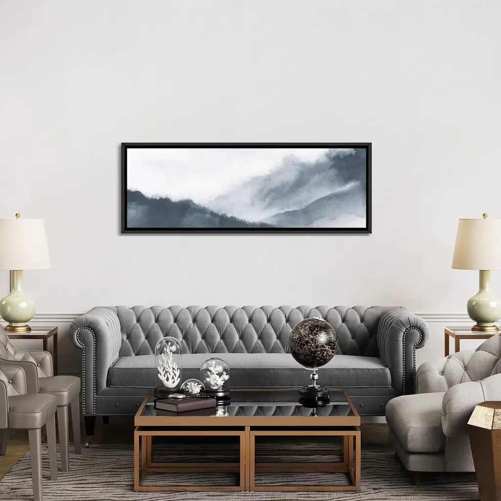 Icanvas "Misty Mountains In Gray Watercolor - Panoramic" By Nouveau Prints Framed Canvas Print - 20x60 - Black