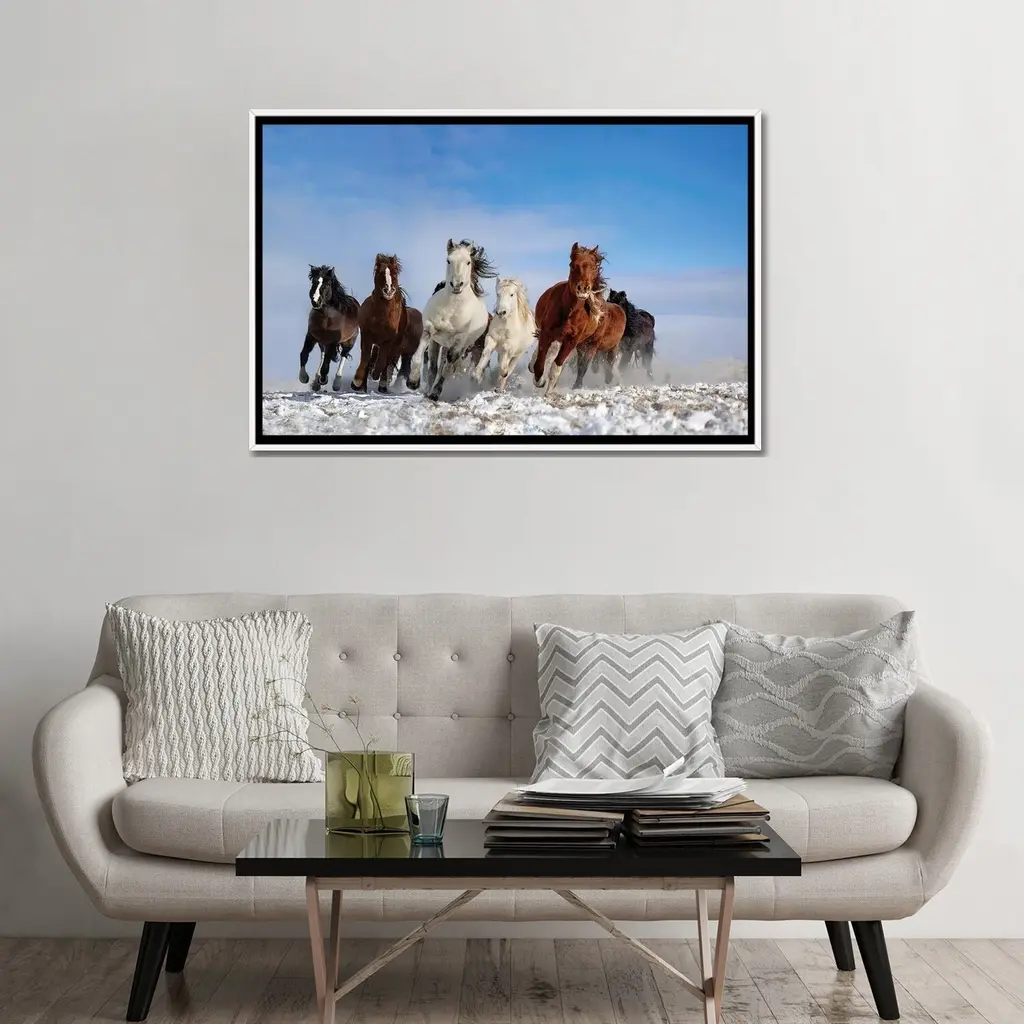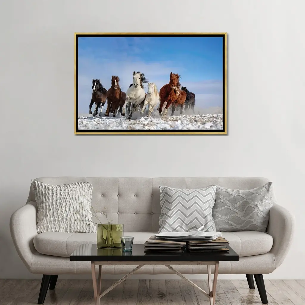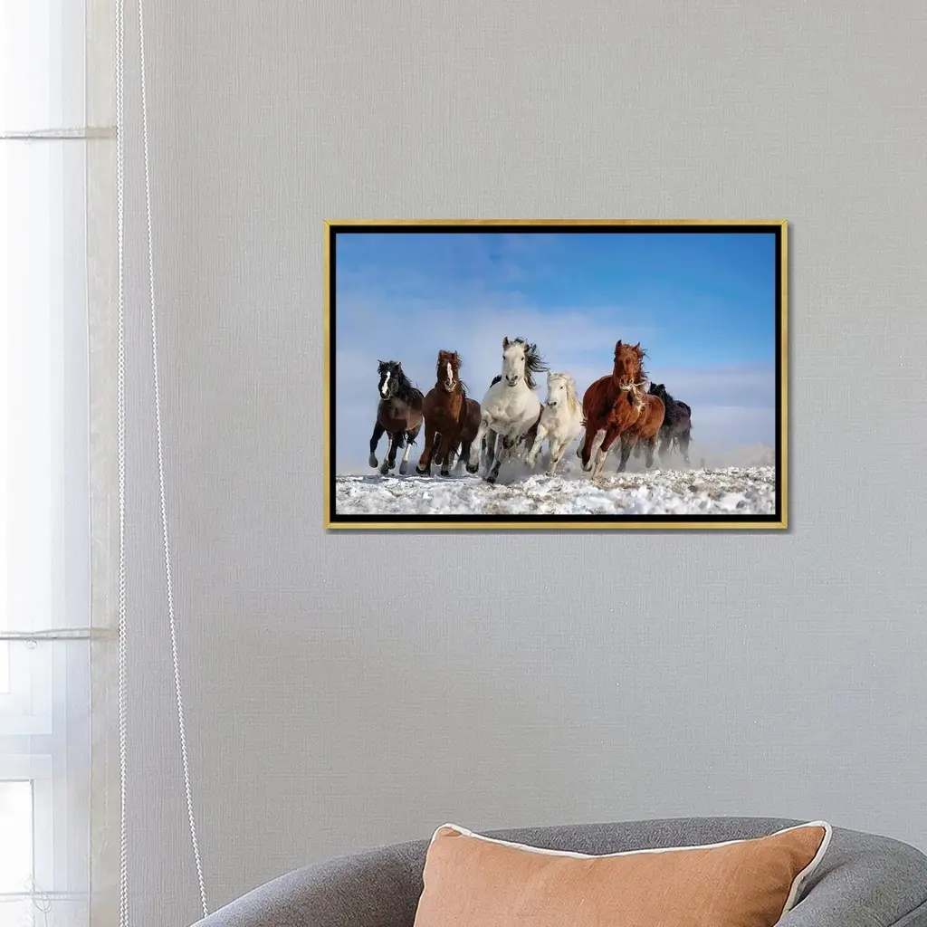 Elevate your space with the iCanvas "Mongolia Horses" by Libby Zhang Framed Canvas Print. Crafted in the USA with artist-grade canvas, this Giclee artwork offers the texture, look, and feel of a fine-art painting. The canvas is professionally hand-stretched and stapled over North American pine-wood bars in a Gallery Wrap style, giving it a polished and gallery-worthy presentation. Mounted to an elegant 2 inch thick hard wood frame, the art is inset, creating a "floating" illusion. With fade-resistant archival inks, the vibrant colors and exceptional detail will remain vivid for decades to come. Embrace contemporary and uncompromising style in your space with this stunning framed canvas print.Features:
