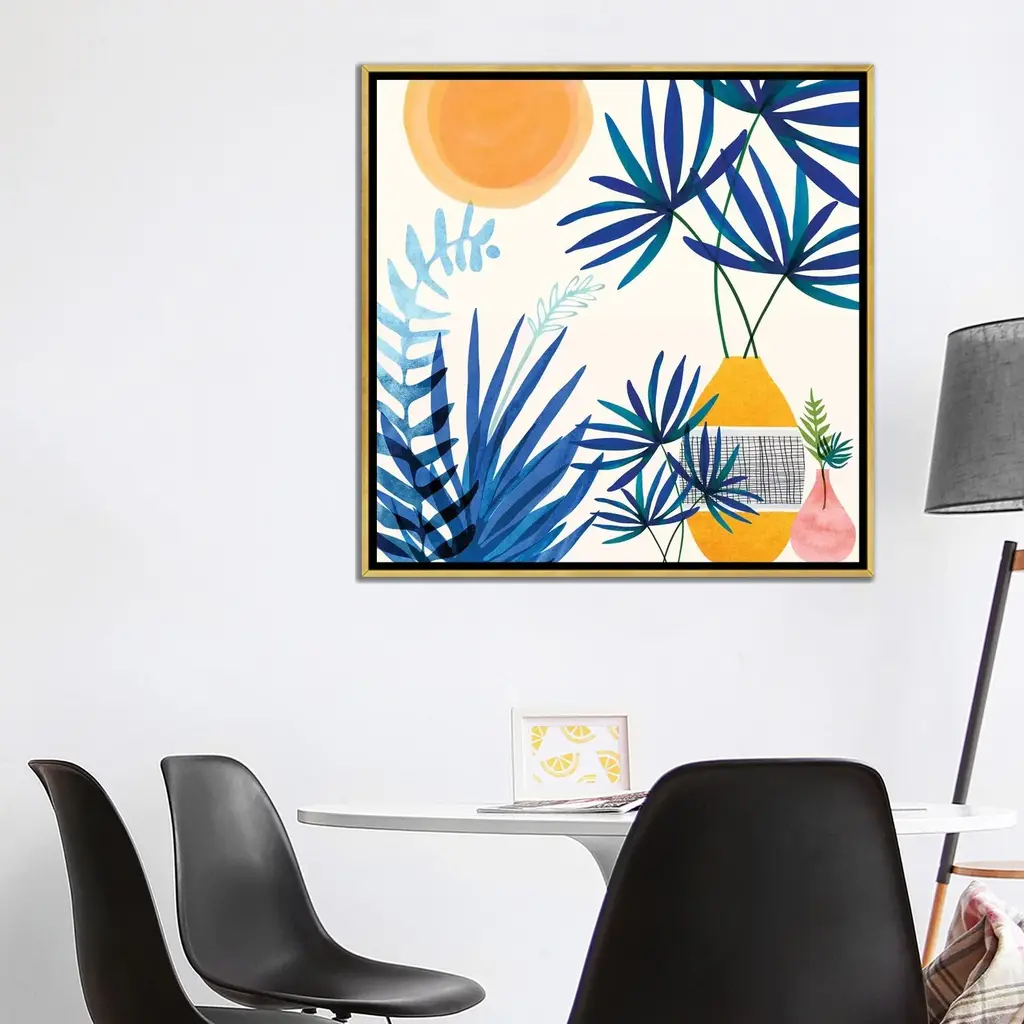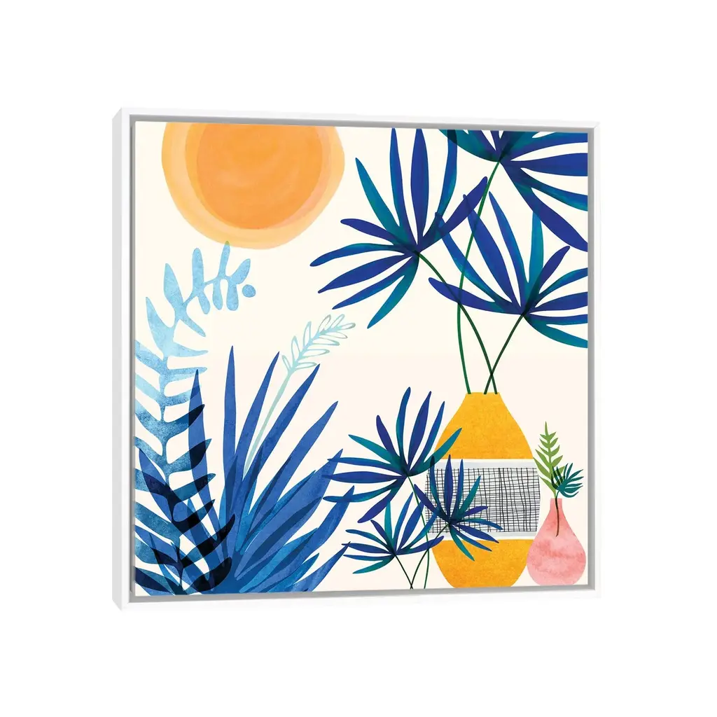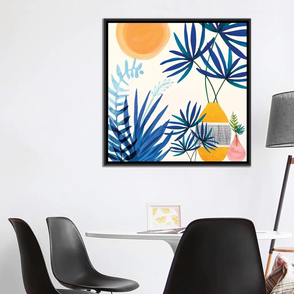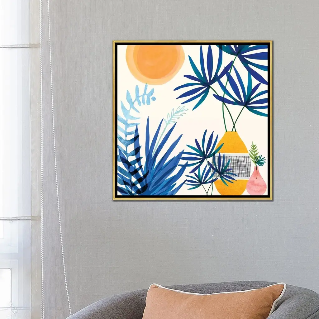 Add a touch of contemporary and uncompromising style to your space with the iCanvas "Moroccan Blues" by Modern Tropical Framed artwork. Crafted in the USA with artist-grade canvas, this Giclee canvas artwork offers the texture, look, and feel of fine-art paintings. The canvas is professionally hand-stretched and stapled over North American pine-wood bars in Gallery Wrap style, giving it a sleek and polished appearance. The artwork is mounted to a 2-inch thick, elegant hardwood frame, creating a "floating" illusion with a 3/8" space between the art and frame. With fade-resistant archival inks, the vibrant colors of this artwork will remain perfect for decades, even when exposed to strong light. Elevate your space with this high-quality and visually stunning piece.Features: