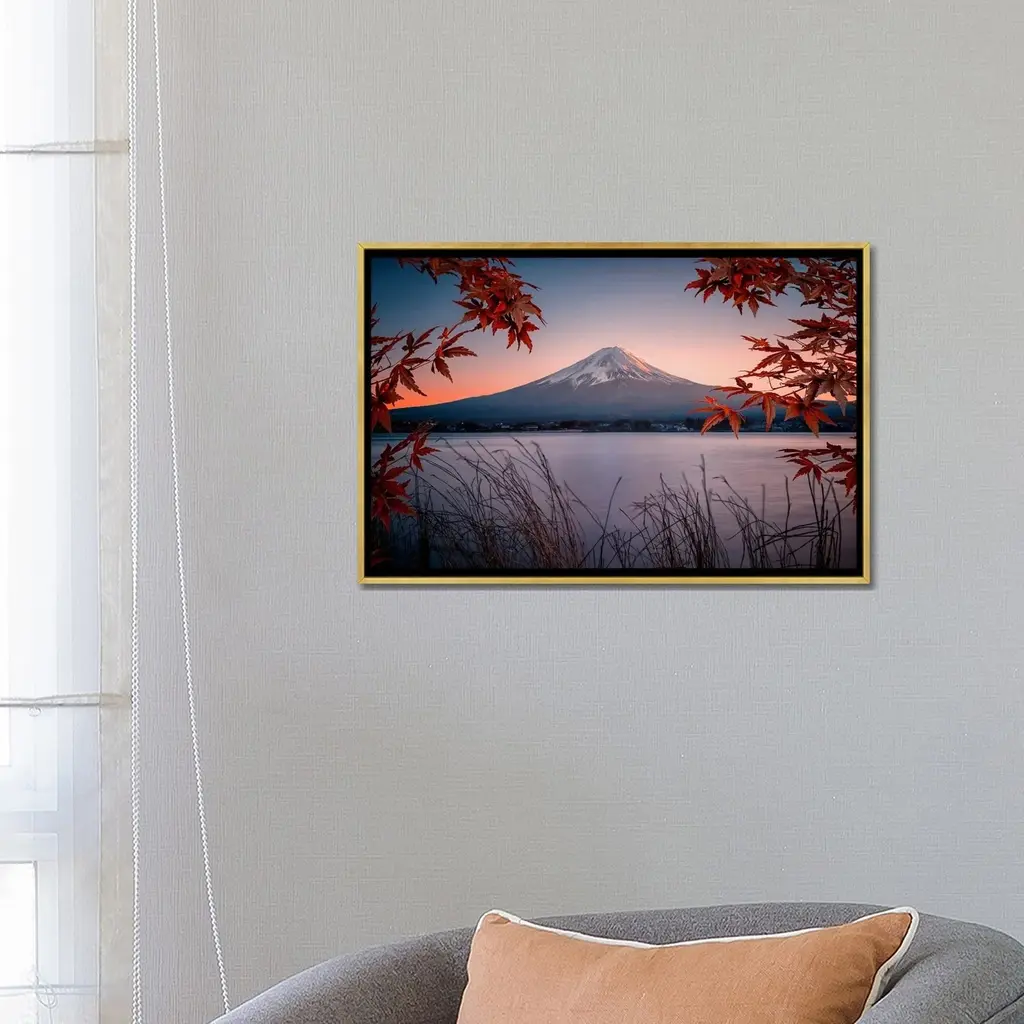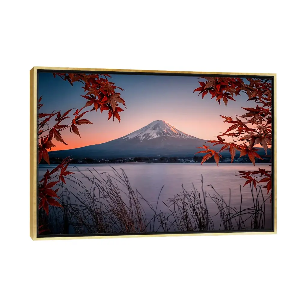 Elevate your space with the stunning "Mt Fuji At Dusk" framed canvas print from iCanvas. Experience the texture and elegance of fine-art paintings with this high-quality Giclee canvas artwork. Made in the USA, this piece is crafted with artist-grade canvas and professionally hand-stretched over pine-wood bars in a Gallery Wrap style. The 2-inch thick hard wood frame adds a touch of sophistication, while the "floating" illusion creates a modern and captivating look. With fade-resistant archival inks, this print guarantees vibrant colors that will remain vivid for decades. Transform your space with this contemporary and detail-oriented masterpiece.Features: