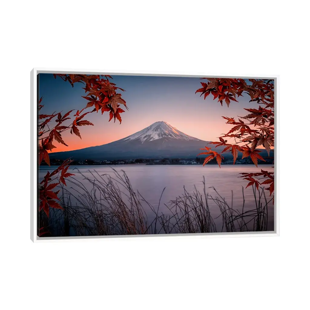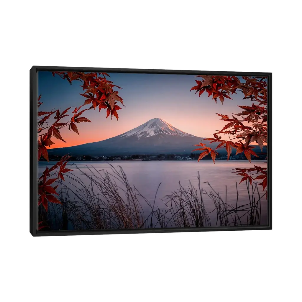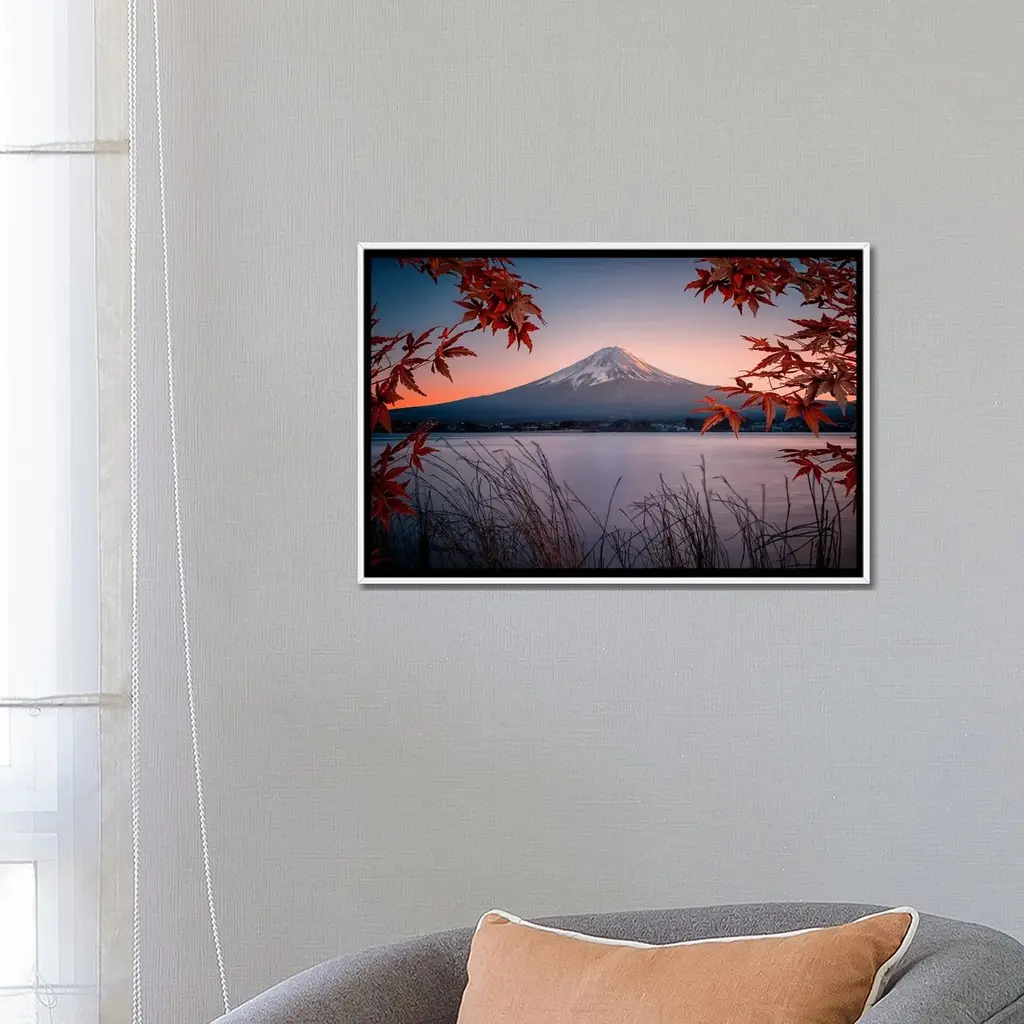 Elevate your space with the stunning "Mt Fuji At Dusk" framed canvas print from iCanvas. Experience the texture and elegance of fine-art paintings with this high-quality Giclee canvas artwork. Made in the USA, this piece is crafted with artist-grade canvas and professionally hand-stretched over pine-wood bars in a Gallery Wrap style. The 2-inch thick hard wood frame adds a touch of sophistication, while the "floating" illusion creates a modern and captivating look. With fade-resistant archival inks, this print guarantees vibrant colors that will remain vivid for decades. Transform your space with this contemporary and detail-oriented masterpiece.Features: