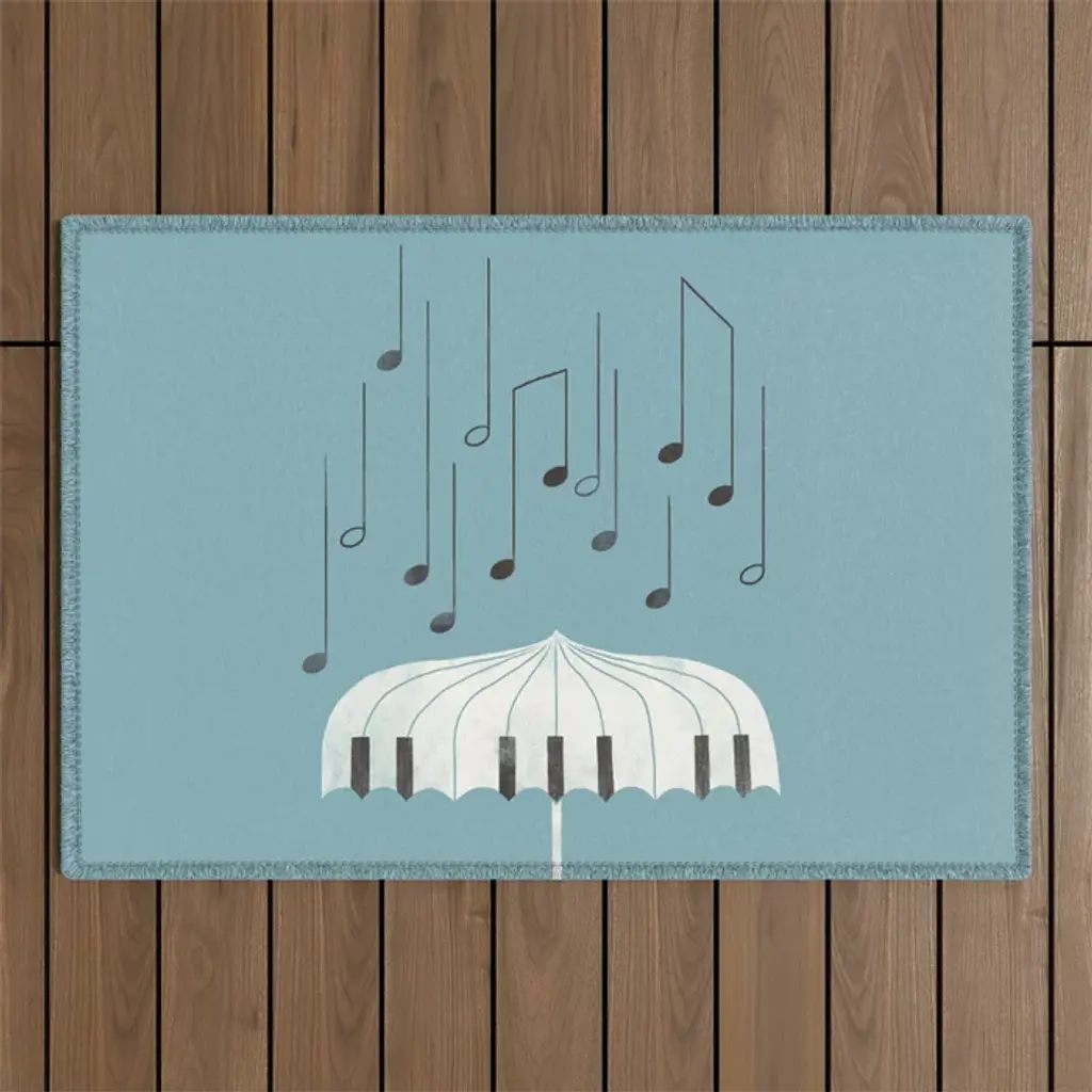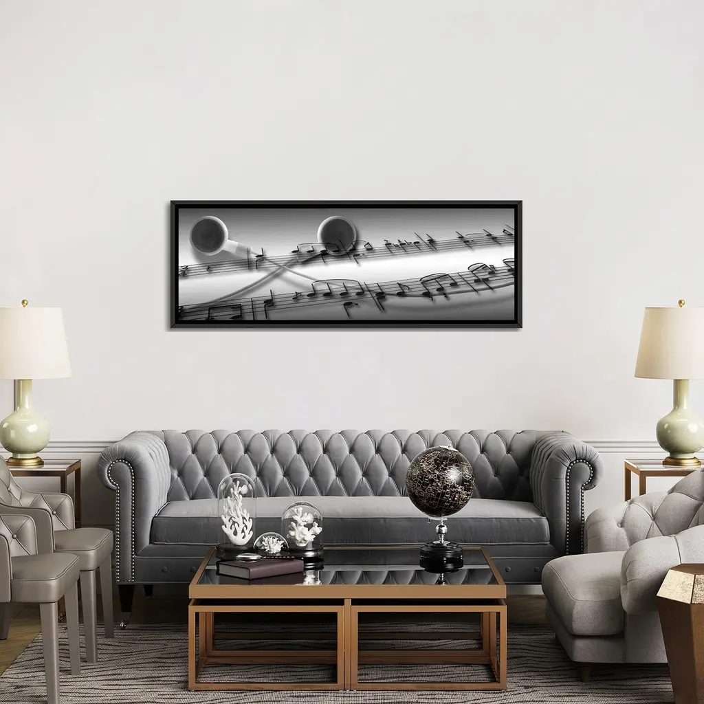Icanvas "Music Notes Superimposed On Ear Phones" By Panoramic Images Framed Canvas Print - 20x60 - Black