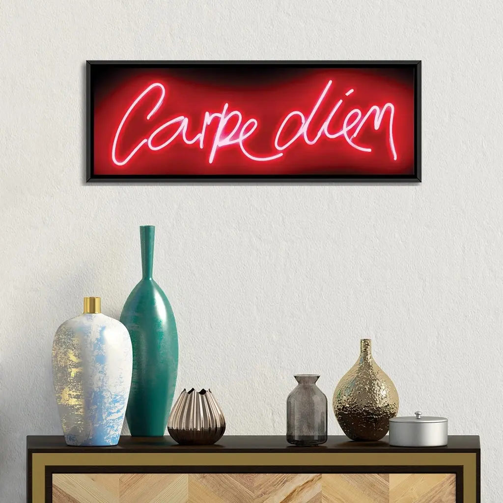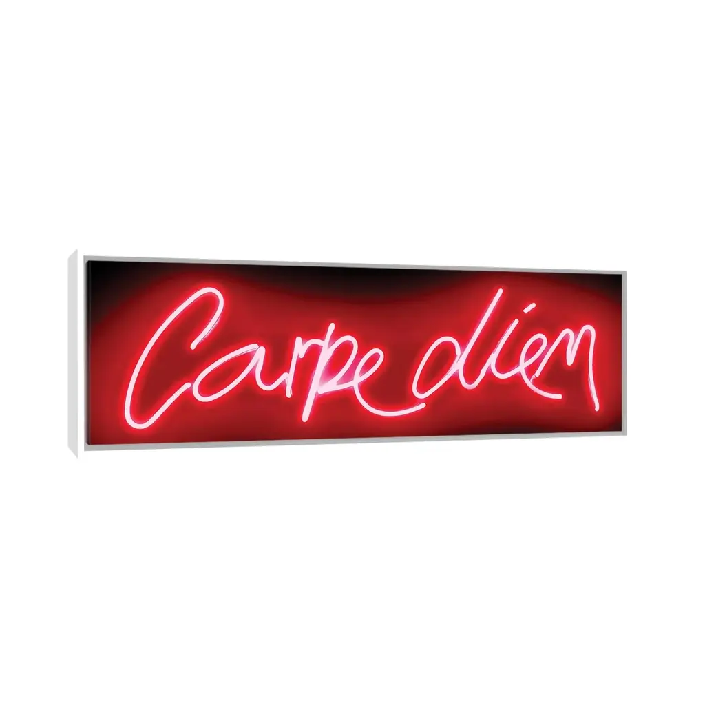 Icanvas "Neon Carpe Diem Red On Black" By Hailey Carr Framed Canvas Print - White - 12x36