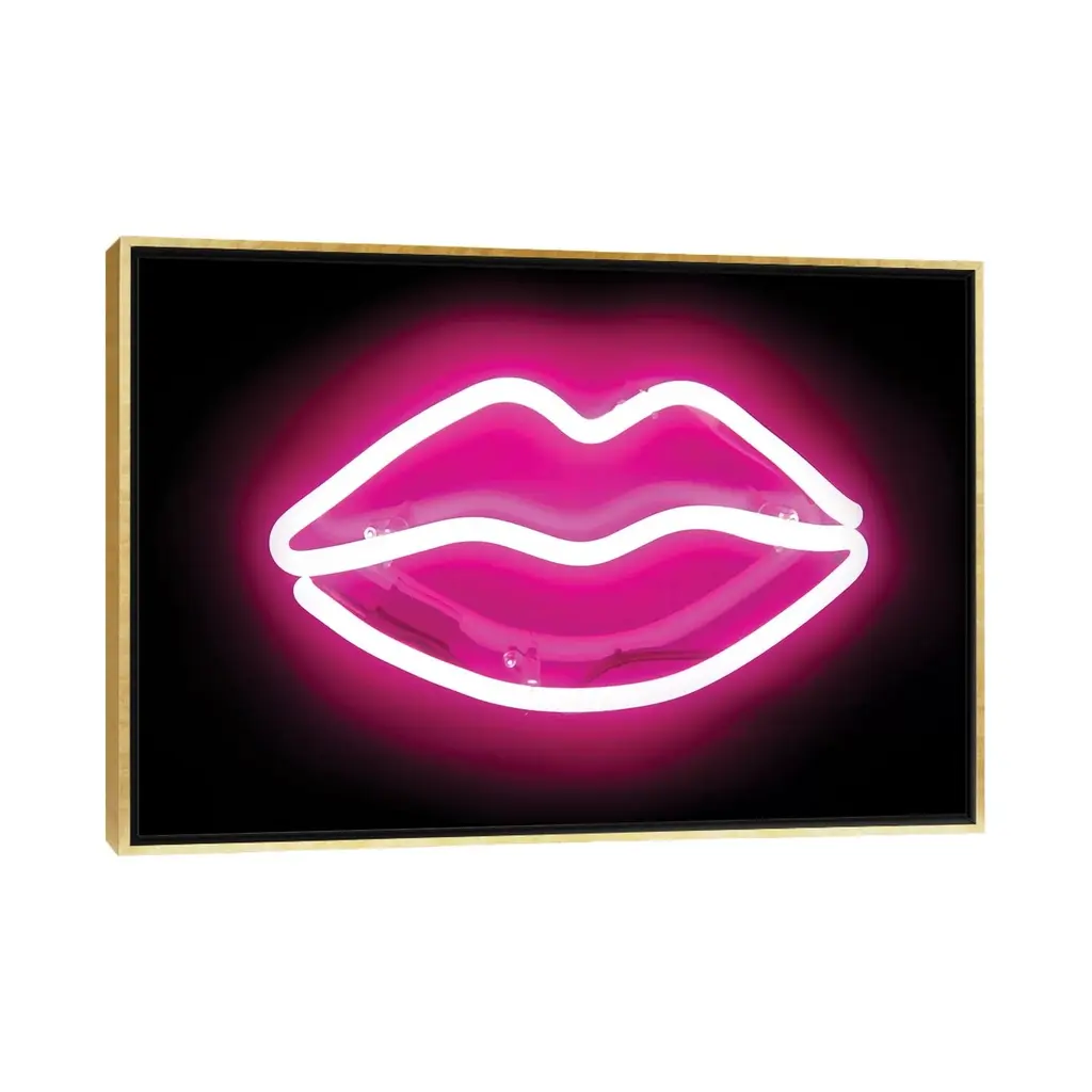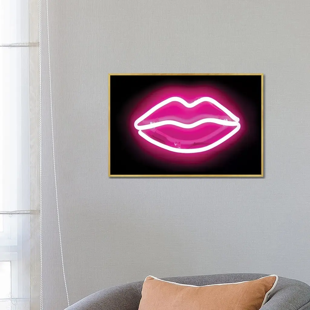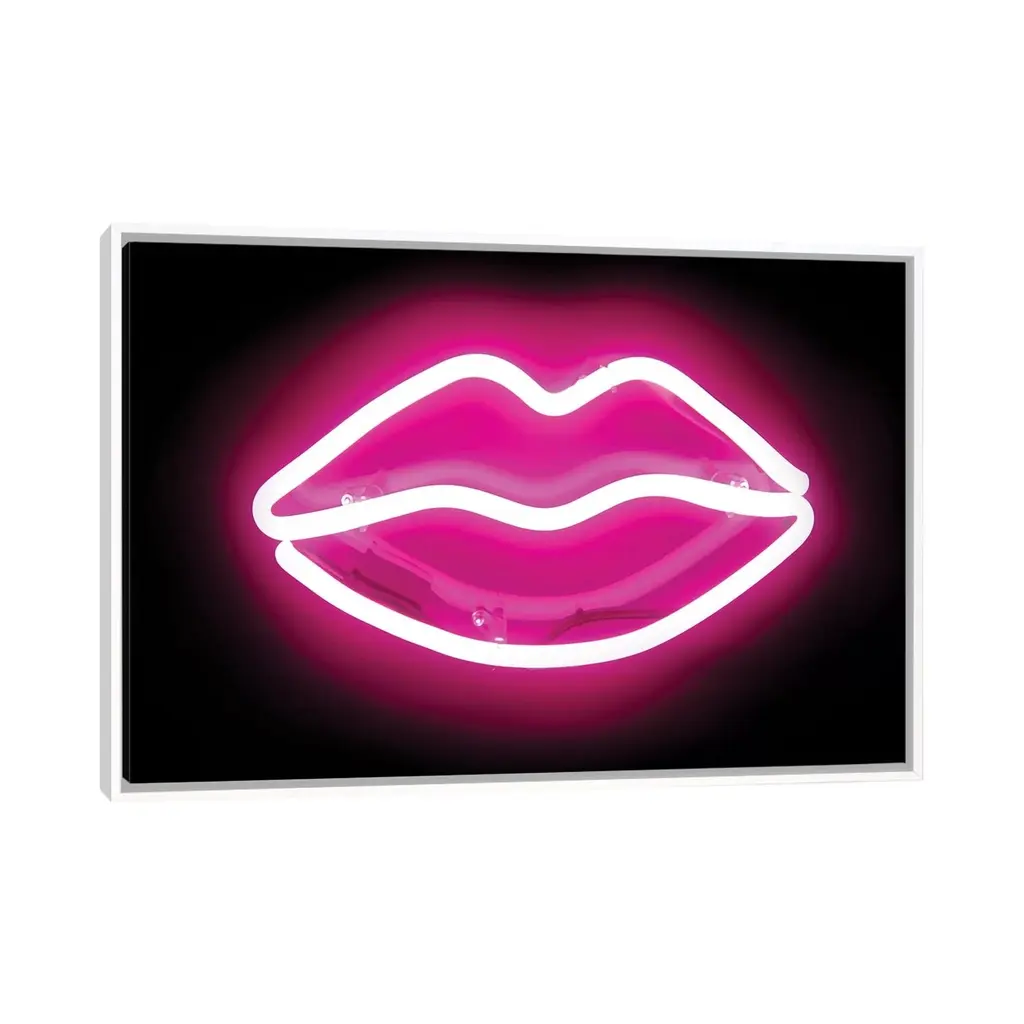 Icanvas "Neon Lips Pink On Black" By Hailey Carr Framed Canvas Print - White - 18x26