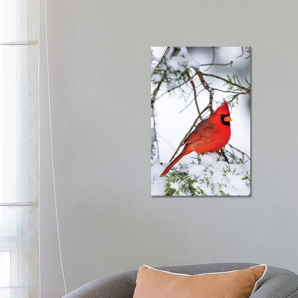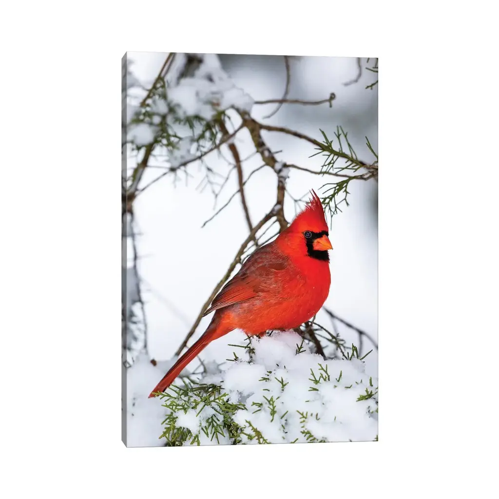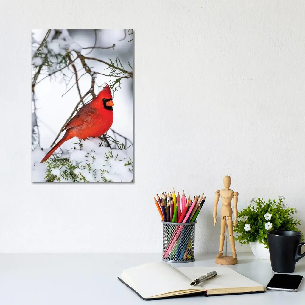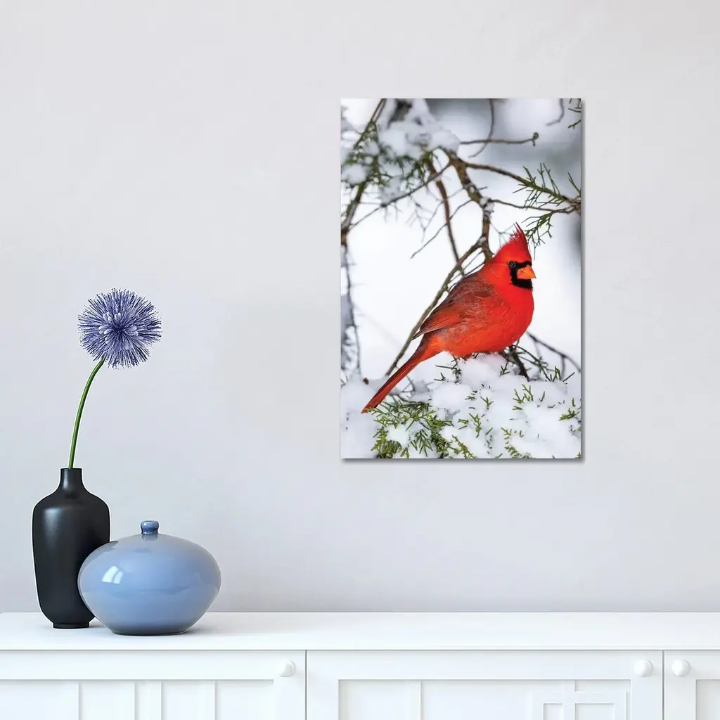 Icanvas "Northern Cardinal Perching On Snowcapped Juniper Tree Branch, Marion County, Illinois" By Panoramic Images Canvas Print - 48x32x1.5