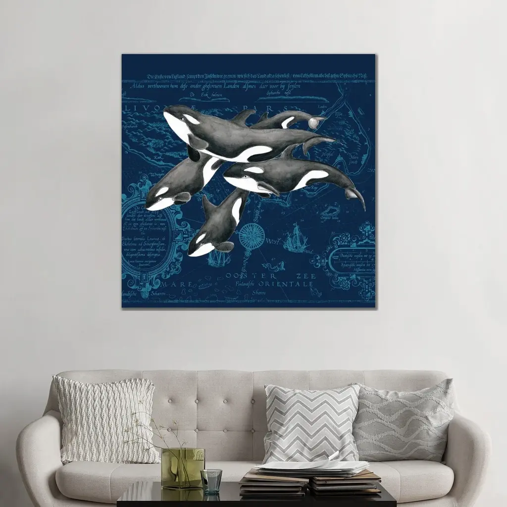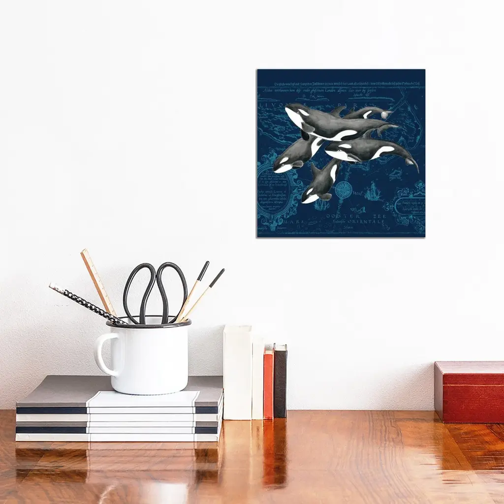 Icanvas "Orca Whale Pod Vintage Map Indigo" By Seven Sirens Studios Canvas Print - 12x12x0.75