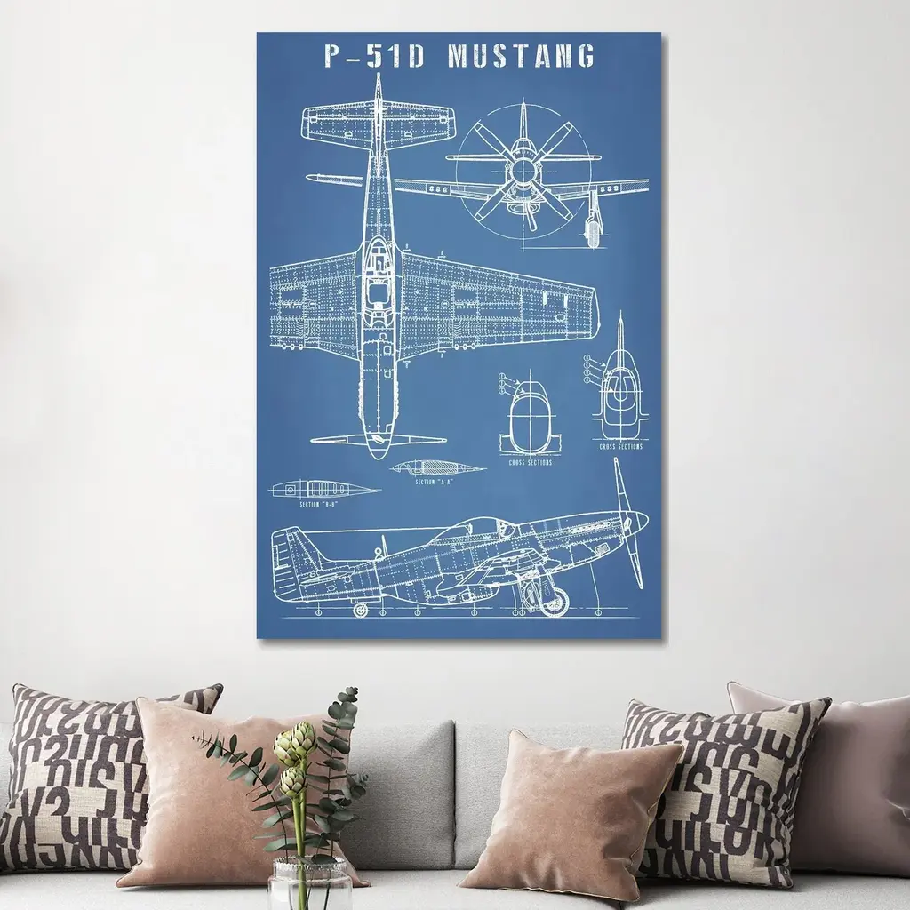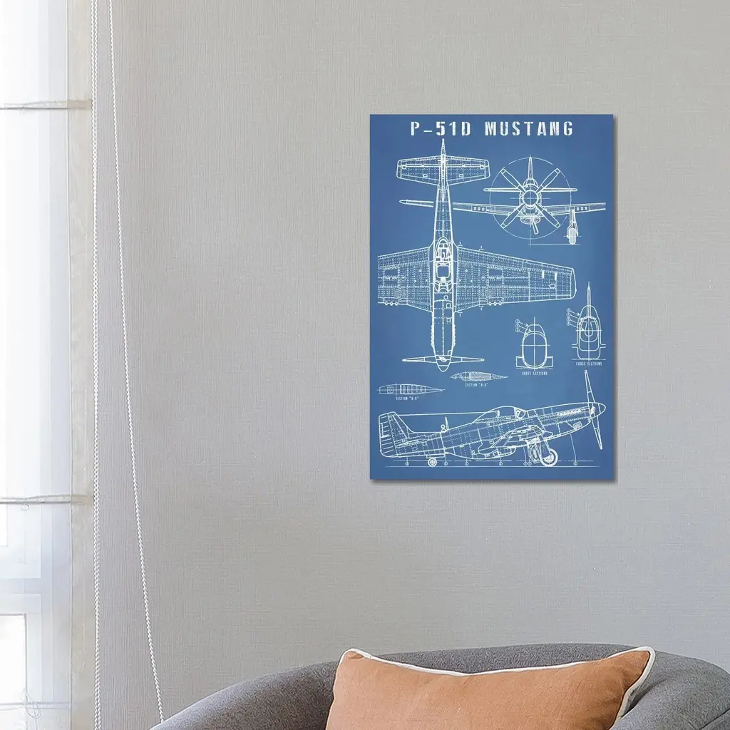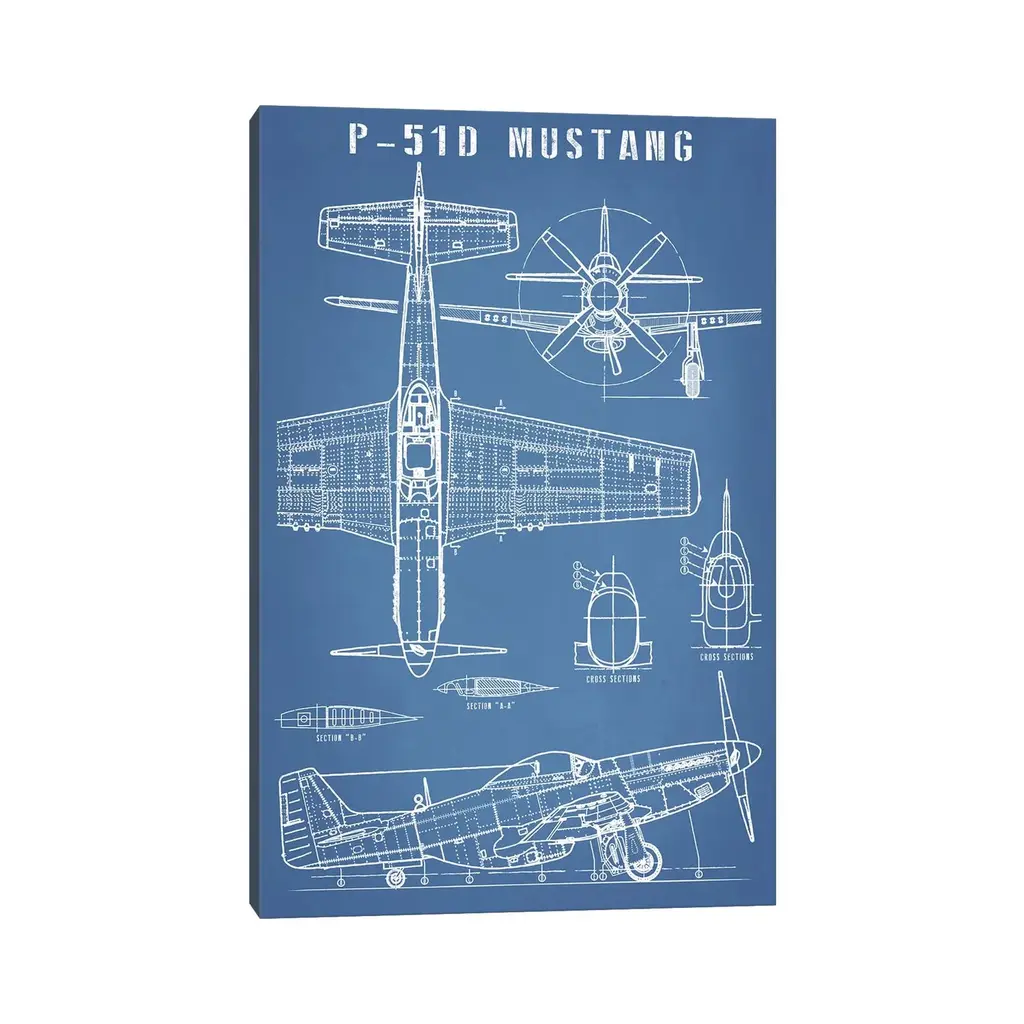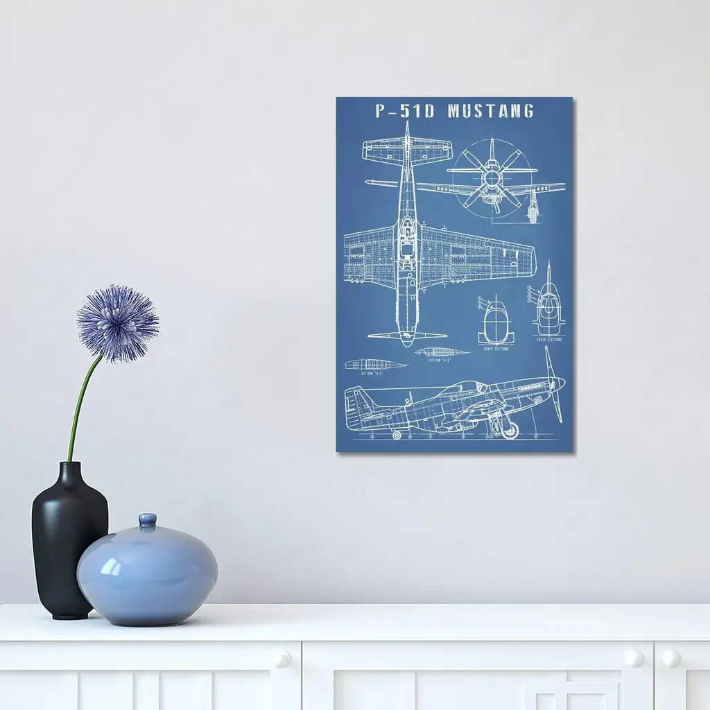 Icanvas "P-51 Mustang Vintage Airplane Blueprint" By Action Blueprints Canvas Print - 18x12x1.5