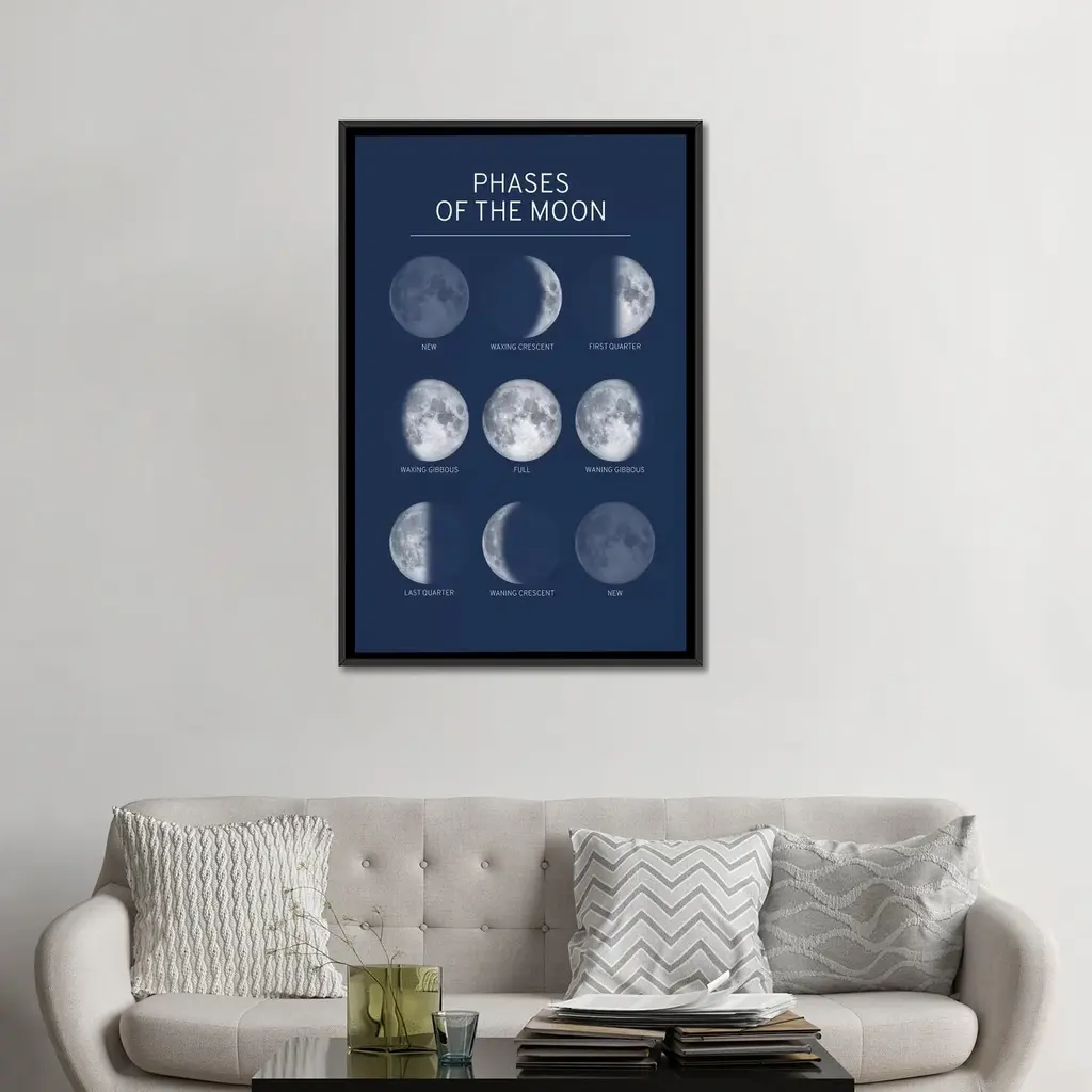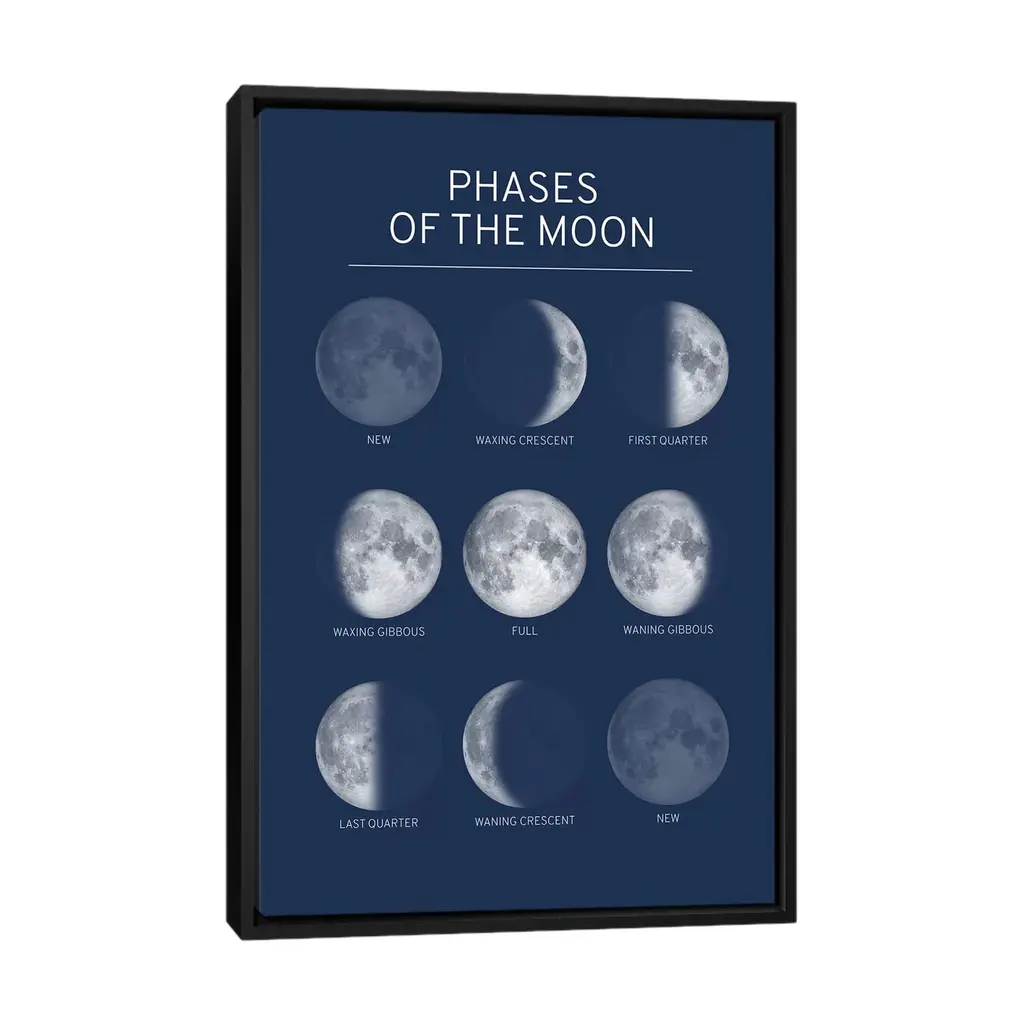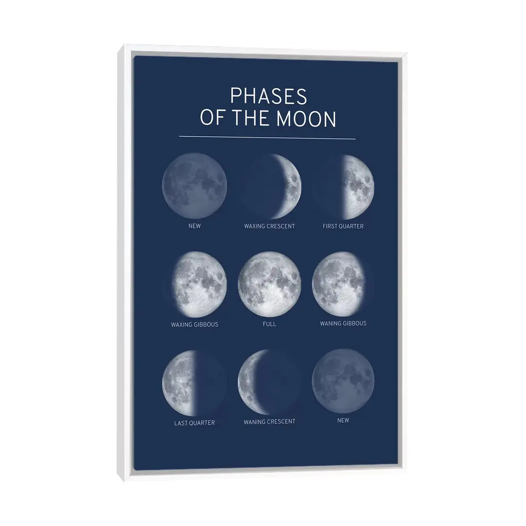 Icanvas "Phases Of The Moon Chart - Blue" By Getyournerdon Framed Canvas Print - White - 40x26
