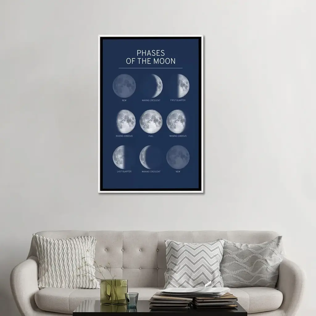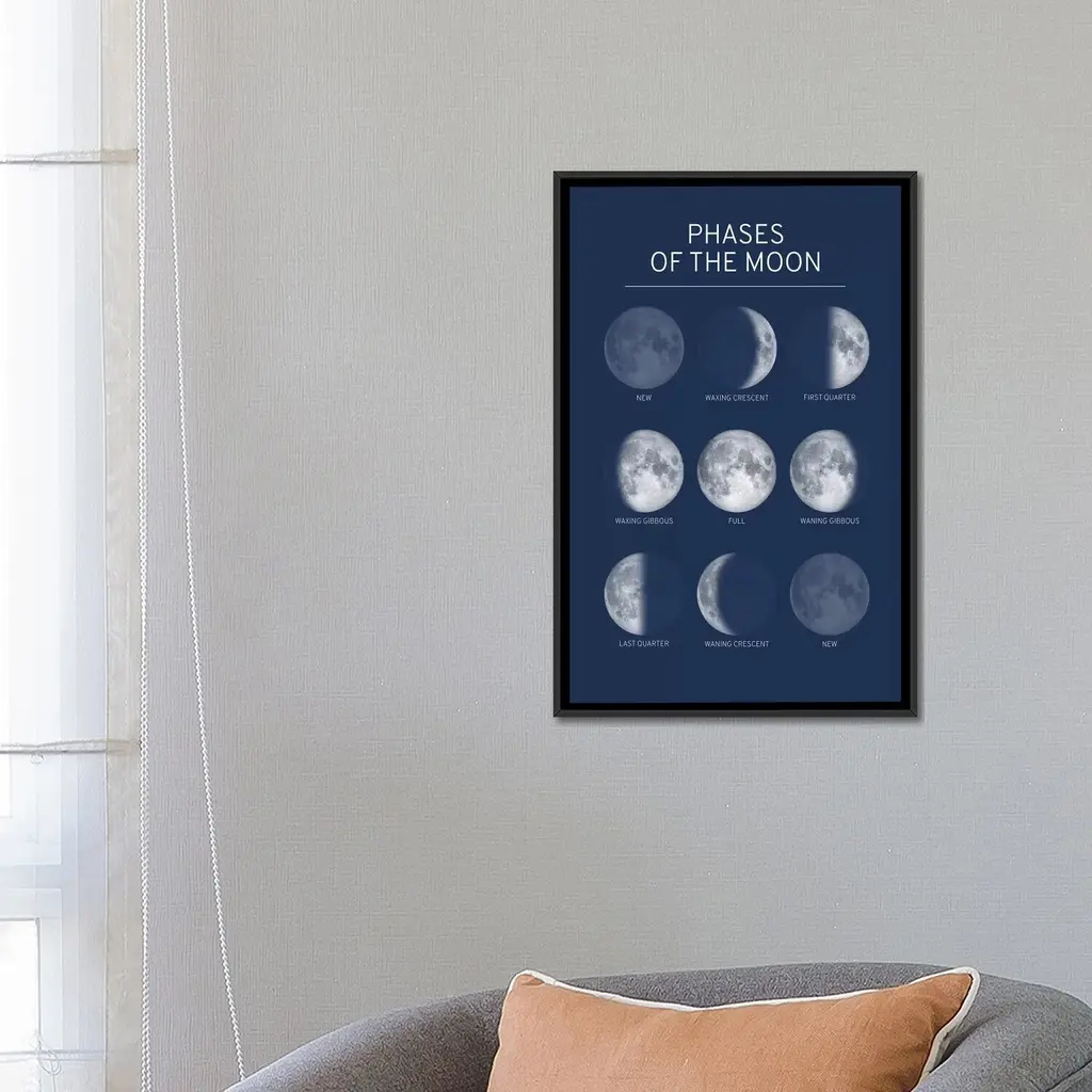 Icanvas "Phases Of The Moon Chart - Blue" By Getyournerdon Framed Canvas Print - White - 48x32
