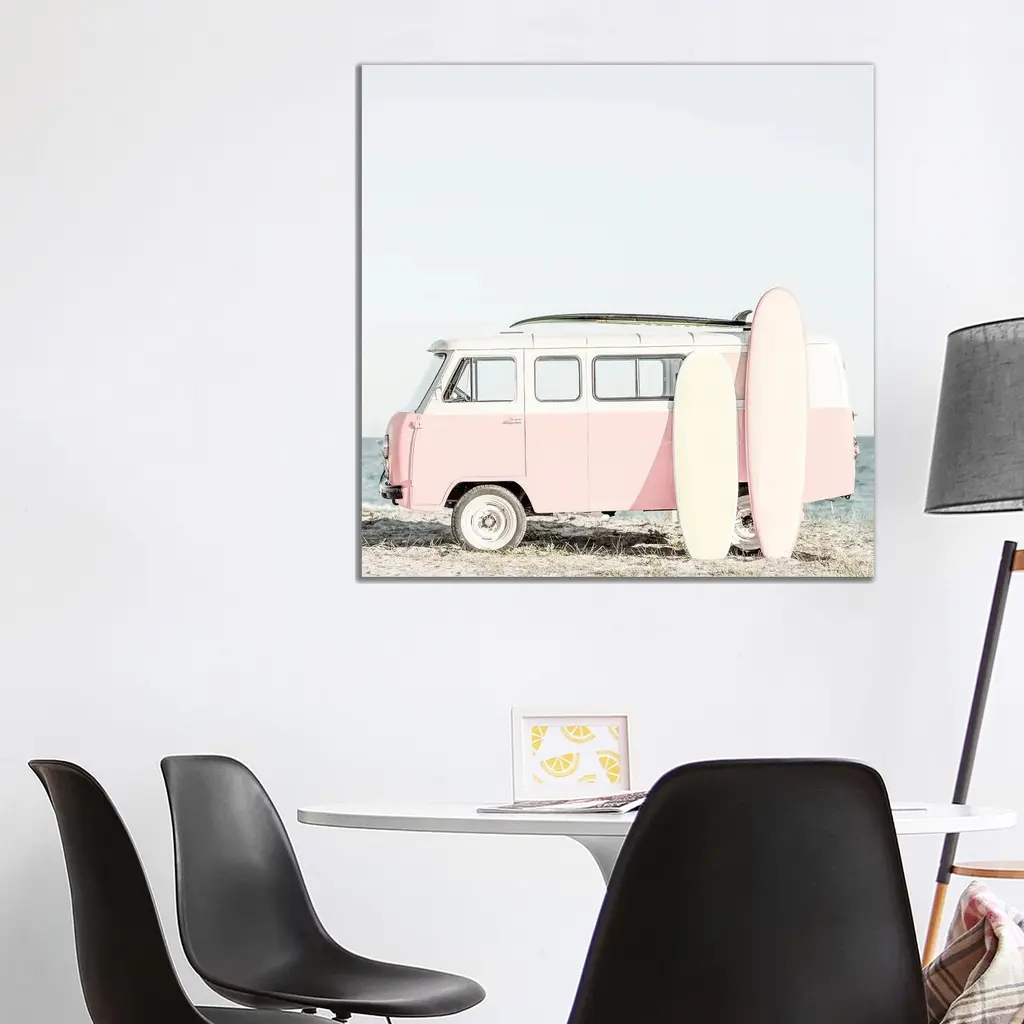 Icanvas "Pink Kombi Van With Surfboards" By Tiny Treasure Prints Canvas Print - 12x12x0.75