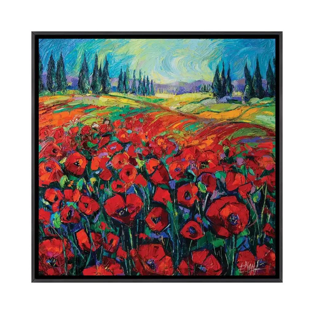 Icanvas "Poppies And Cypresses" By Mona Edulesco Framed - Ebony - 12x12