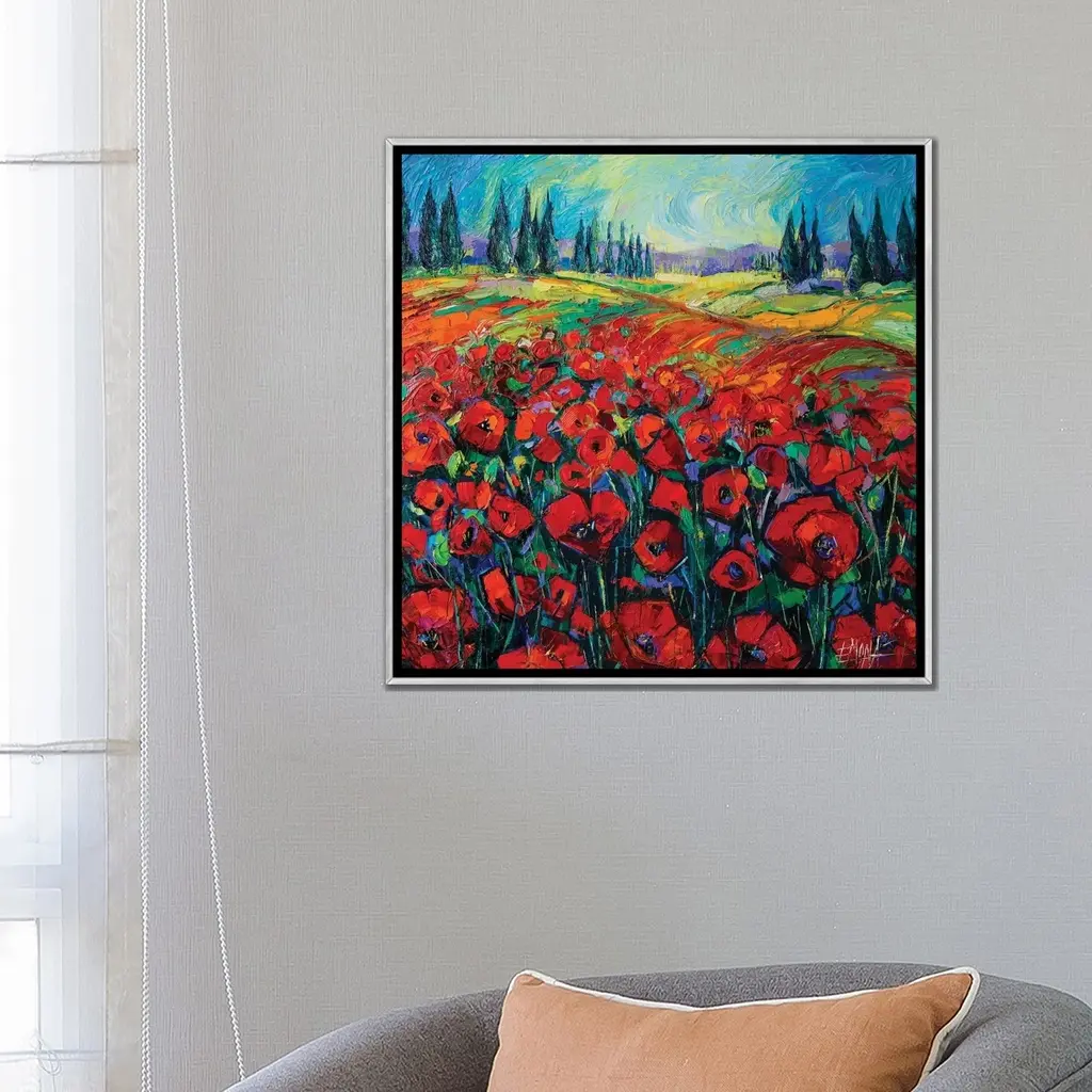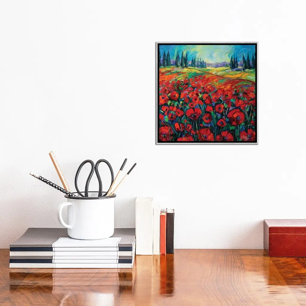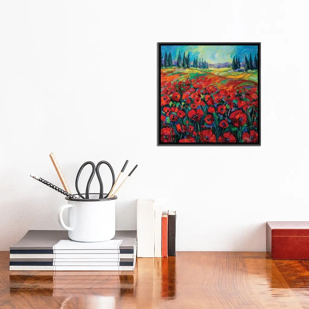 Icanvas "Poppies And Cypresses" By Mona Edulesco Framed - Ebony - 18x18