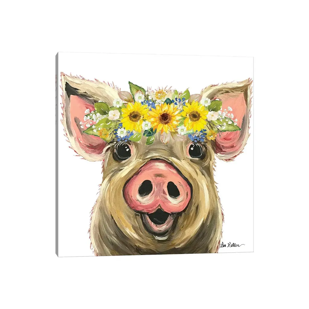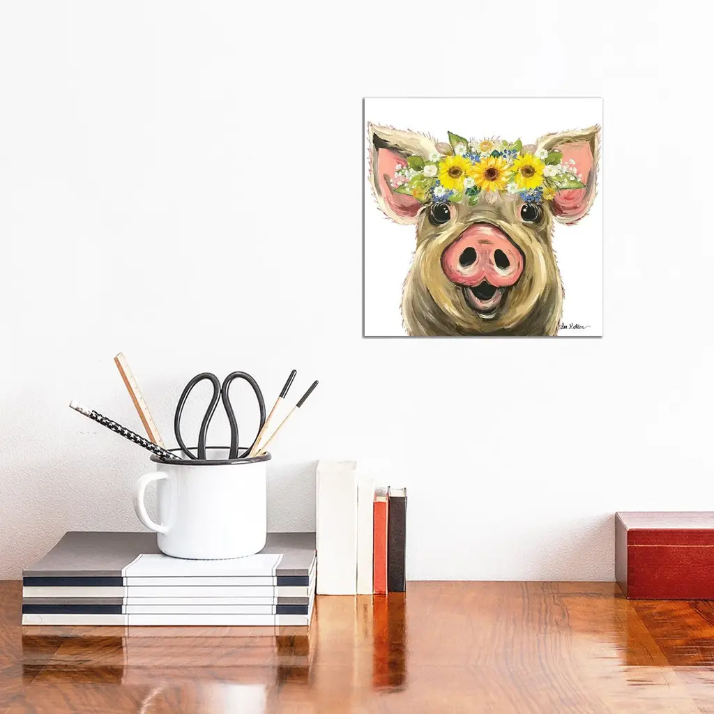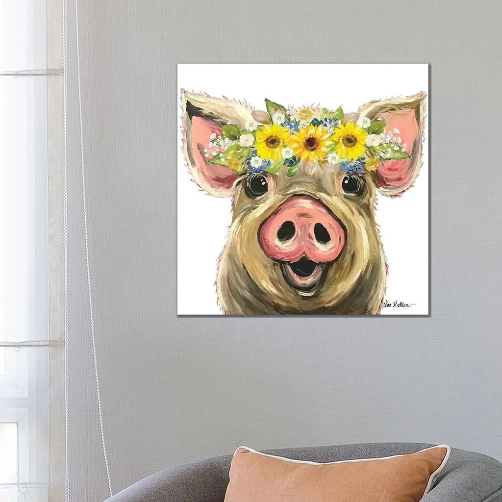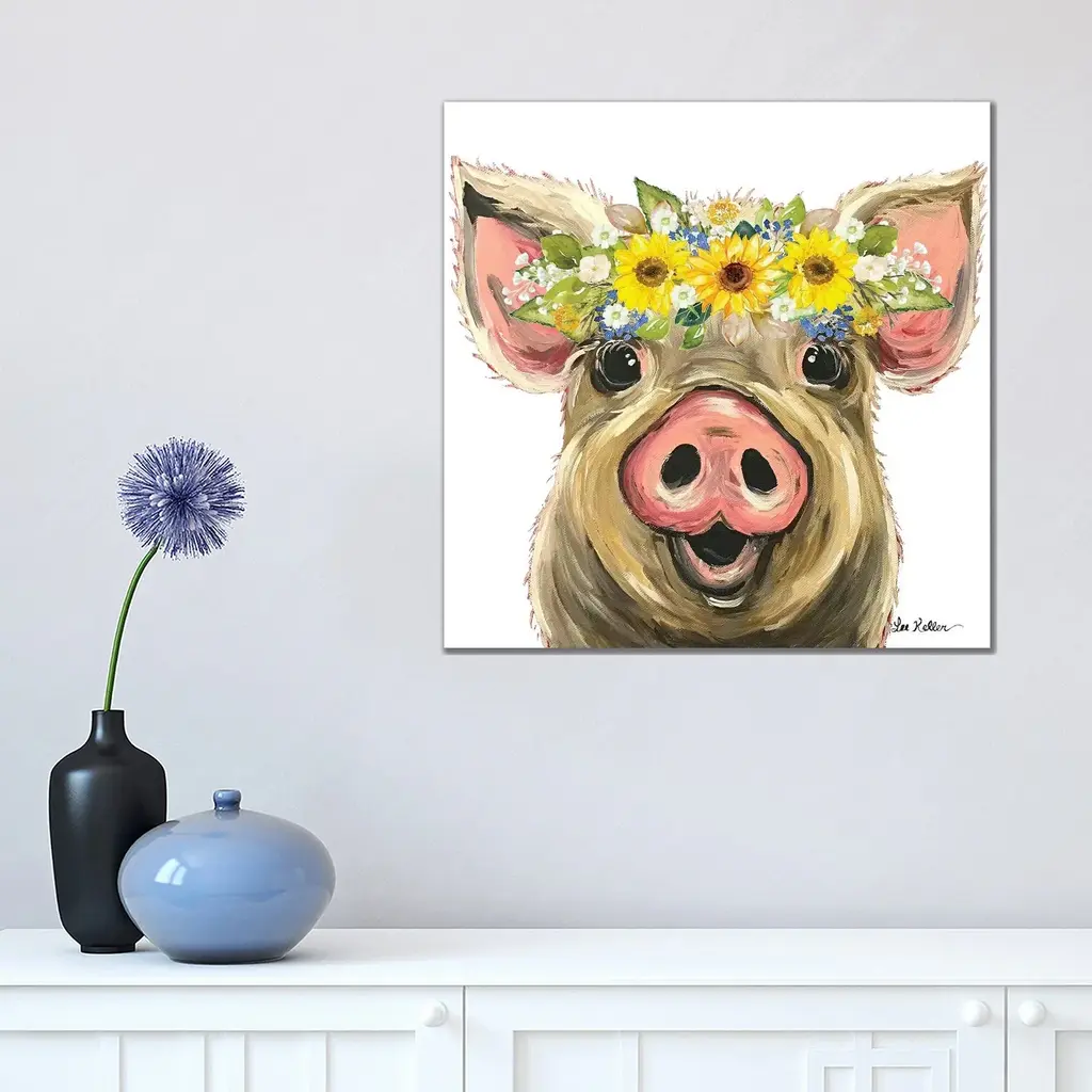 Icanvas "Posey The Pig With Sunflower Flower Crown" By Hippie Hound Studios Canvas Print - 12x12x1.5