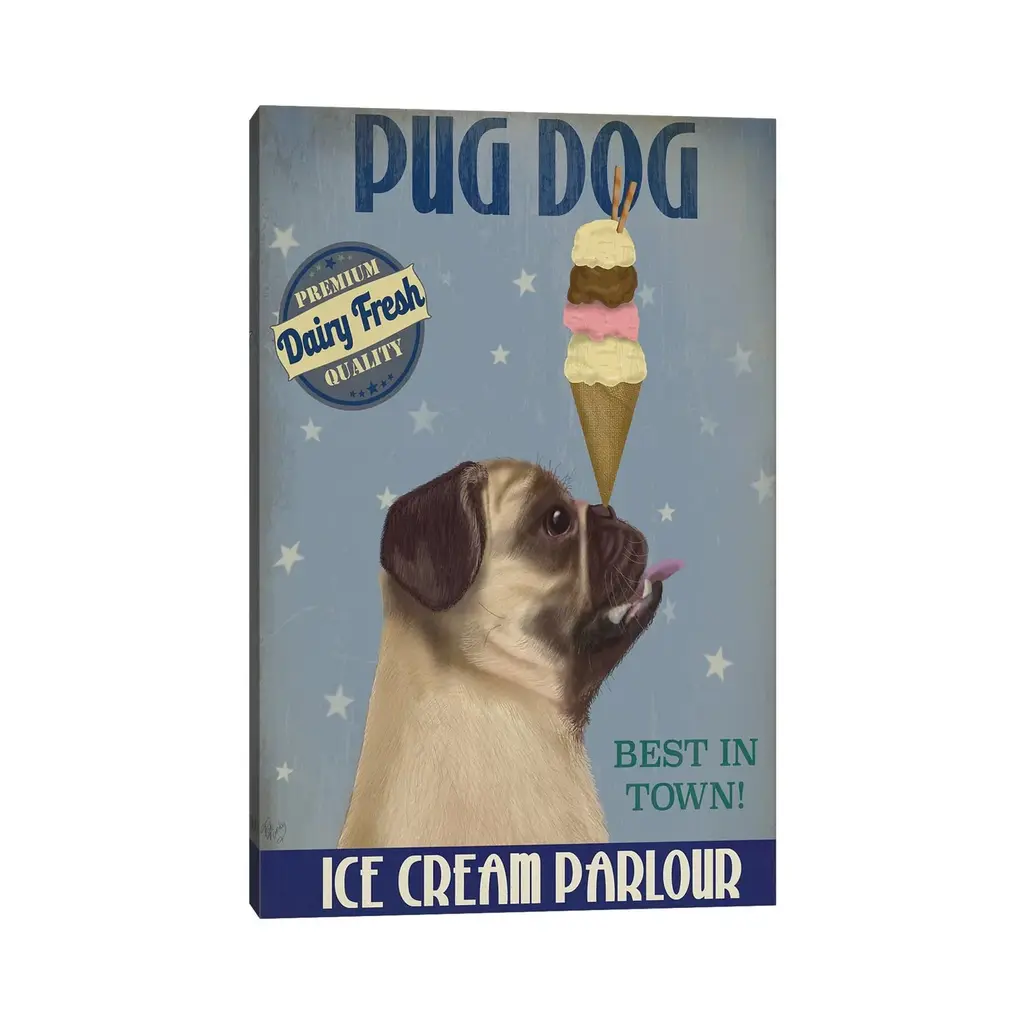 Icanvas "Pug, Fawn, Ice Cream" By Fab Funky Canvas Print - 12x8x0.75