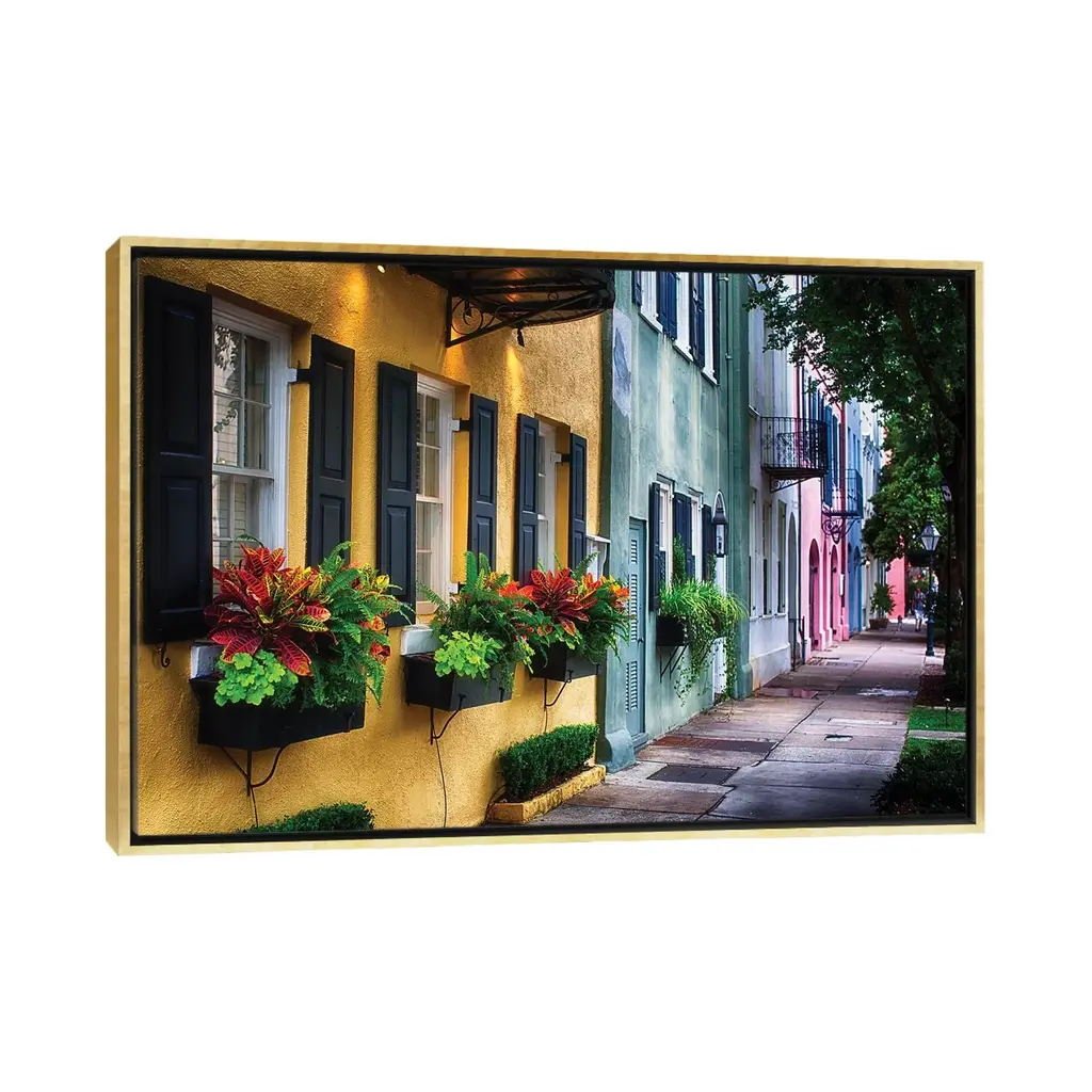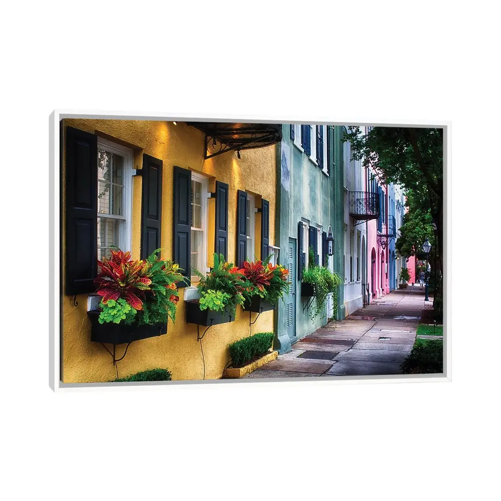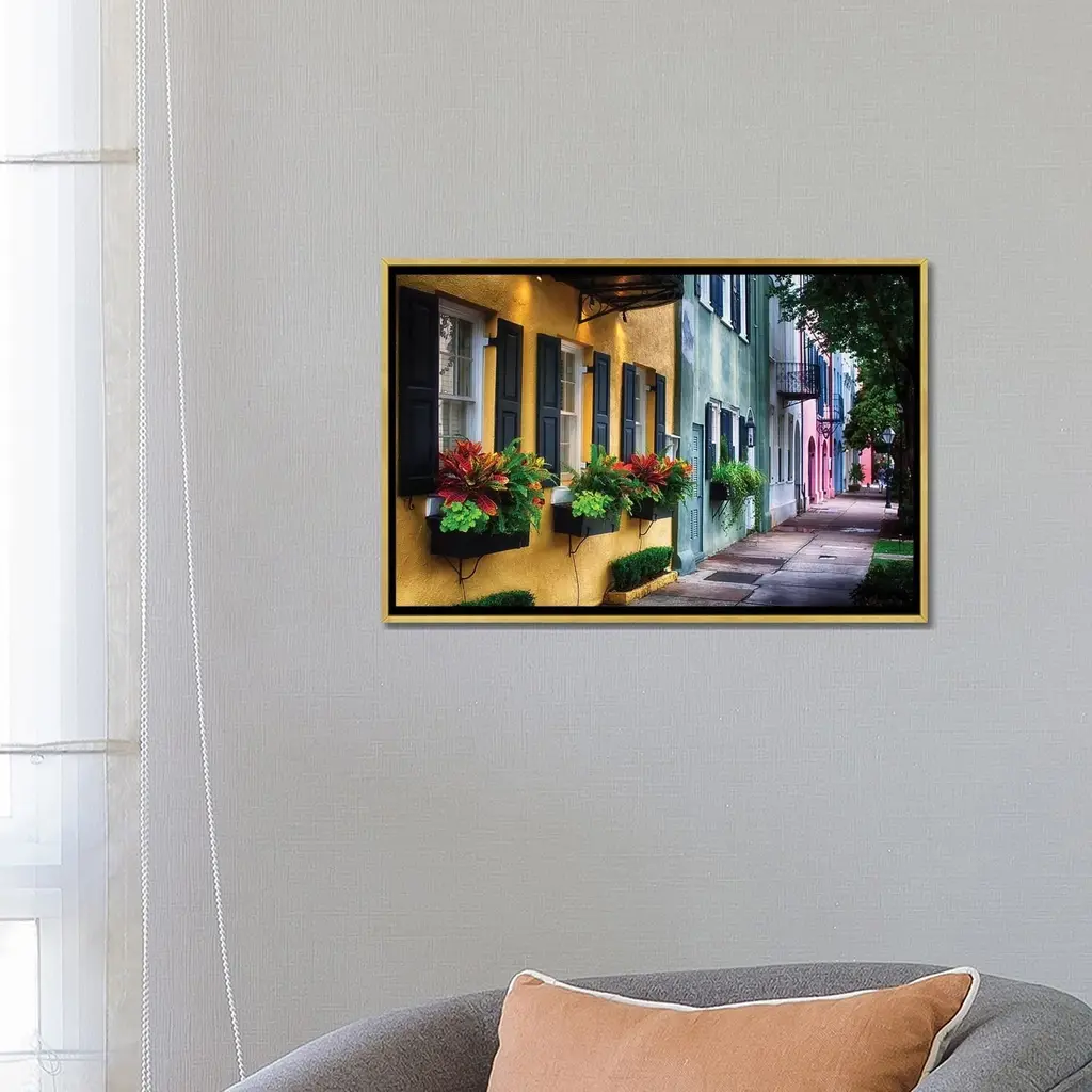 Icanvas "Rainbow Row, Row Of Colorful Historic Houses,east Bay Street, Charleston, Sc" By George Oze Framed Canvas Print - Black - 26x40